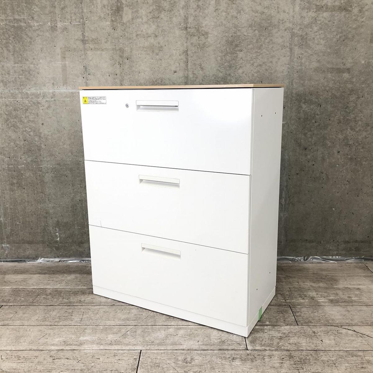 【書類を一気に収納!大型取っ手で開け閉めしやすい!】■ウチダ(UCHIDA)製 ハイパーストレージ(HS)シリーズ 3段ラテラル書庫 ローキャビネット ■ホワイト/天板:ナチュラル ■シリンダー錠 ※キズ有- 千葉店