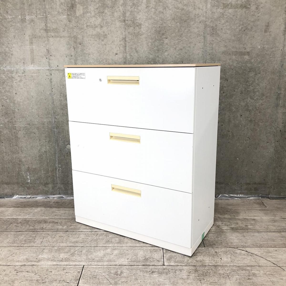 【書類を一気に収納!大型取っ手で開け閉めしやすい!】■ウチダ(UCHIDA)製 ハイパーストレージ(HS)シリーズ 3段ラテラル書庫 ローキャビネット ■ホワイト/天板:ナチュラル ■シリンダー錠 ※日焼け・キズあり【弊社使用欄:A01041700】- 新宿サテライト