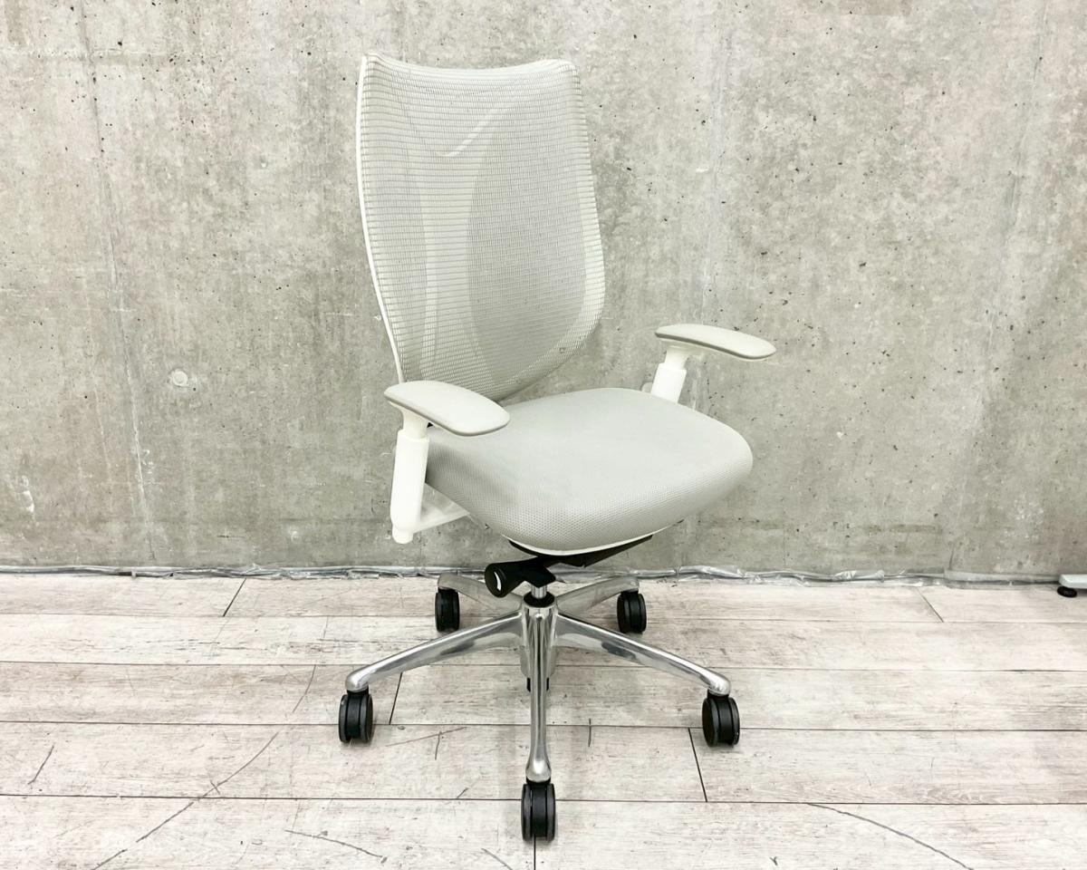 【前傾チルト付!流れるような美しいフォルムの最高級メッシュチェア!】■オカムラ(okamura)製 Sabrina(サブリナ)チェア 肘付ハイバック ■アジャストアーム(可動肘) ■背面メッシュ ■ライトグレー × ホワイトフレーム