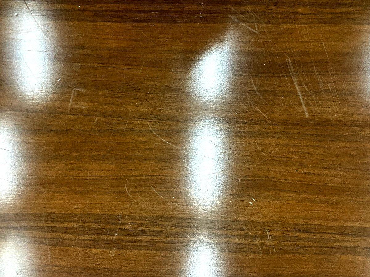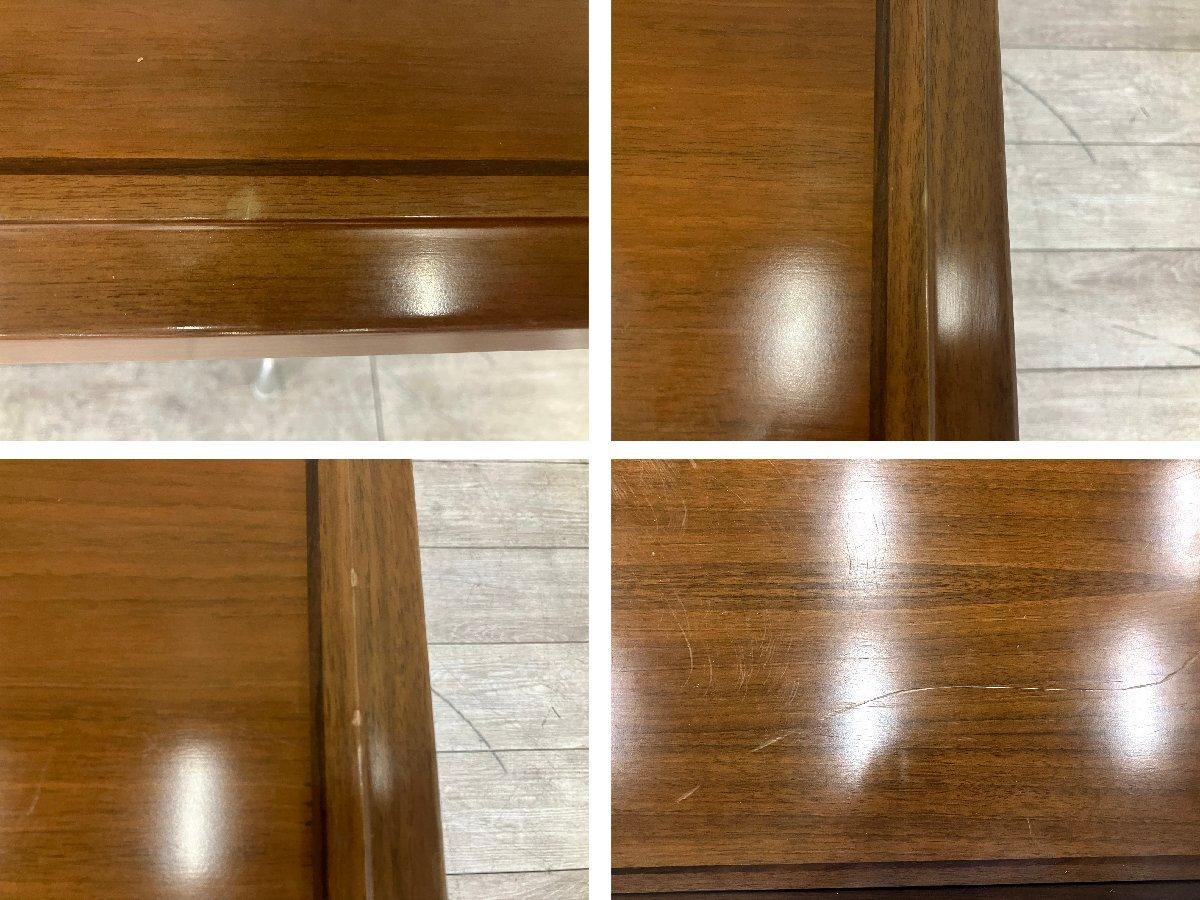 - 目立つ箇所あり傷・凹みが多数、深い傷・凹みが一部ある。(例、天板、幕板、棚板、サイド部分、脚部等にある。)