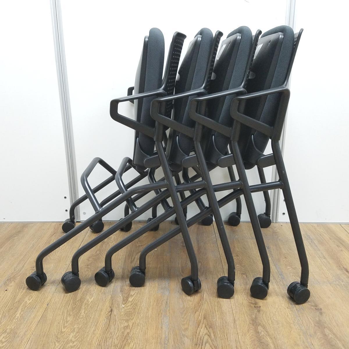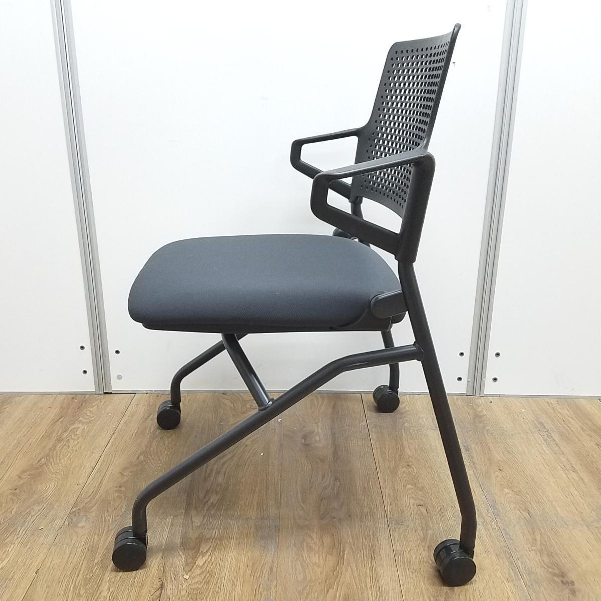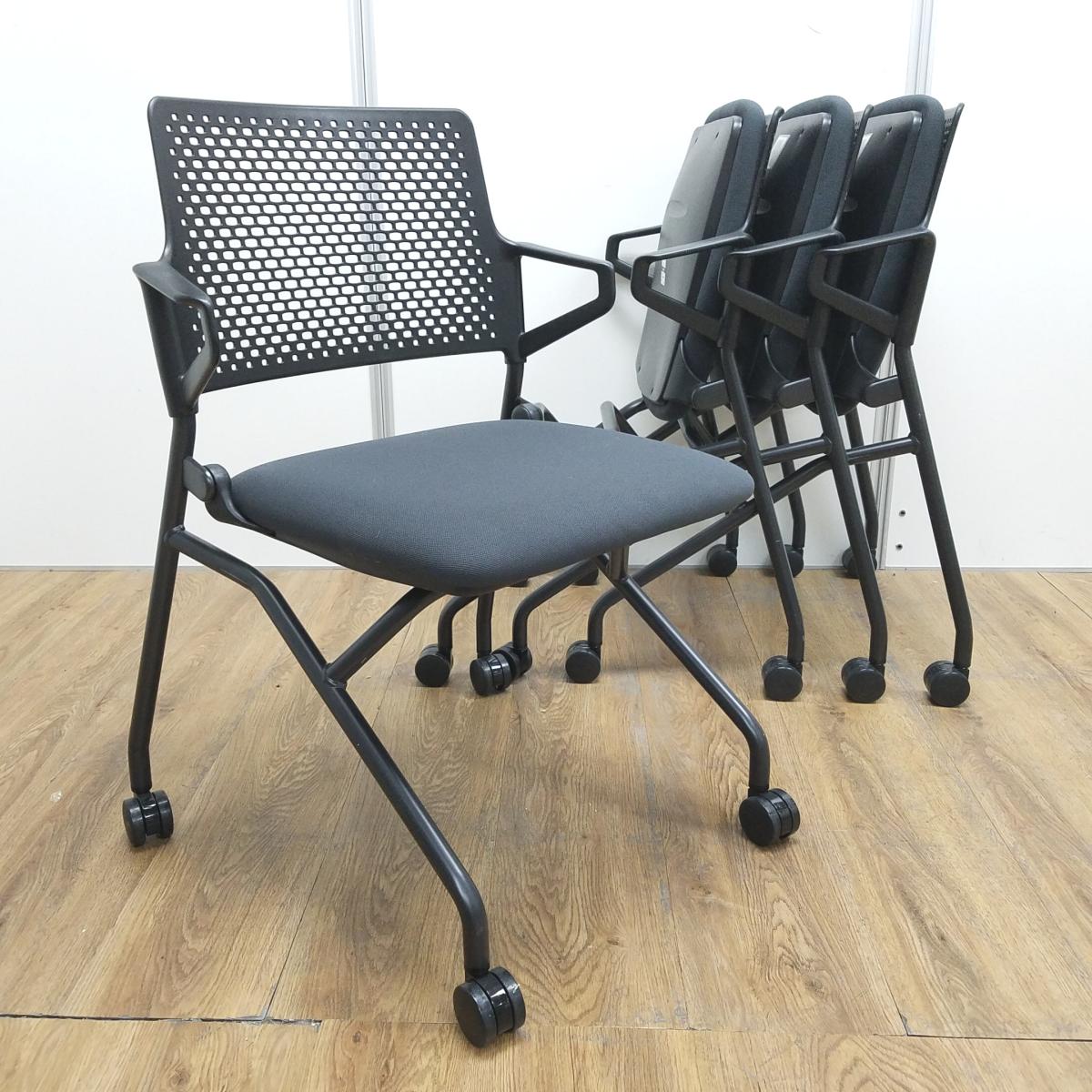 【4脚セット!!】ウチダ製 FM-345 ダークグレイ 肘付き 会議用 キャスター付 背面樹脂メッシュ 折り畳んで収納! キャスター付で動作も楽々! ネスティングチェア!!- 京都東寺店