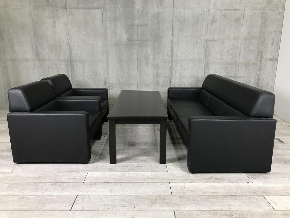 【高級感溢れるレザー生地!ミドルクラスの応接セット!】■オカムラ(okamura)製 応接セット一式 / 1人用応接ソファ2台 & 3人用応接ソファ1台 & センターテーブル ■ソファー(レザー張地):ブラック/テーブル:木目ブラウン- 春日部・越谷店