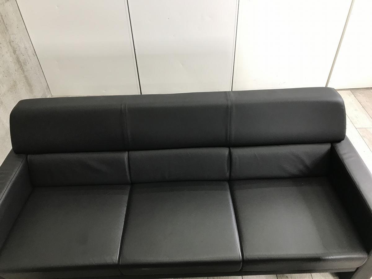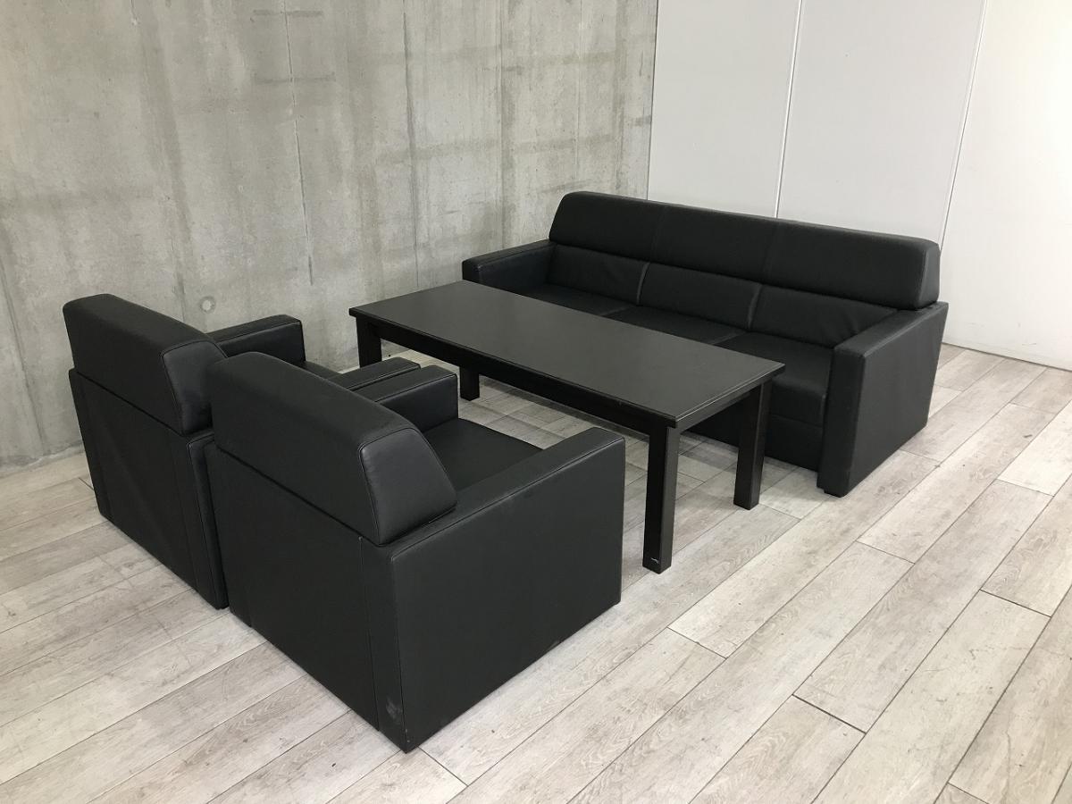 【高級感溢れるレザー生地!ミドルクラスの応接セット!】■オカムラ(okamura)製 応接セット一式 / 1人用応接ソファ2台 & 3人用応接ソファ1台 & センターテーブル ■ソファー(レザー張地):ブラック/テーブル:木目ブラウン- 在庫数