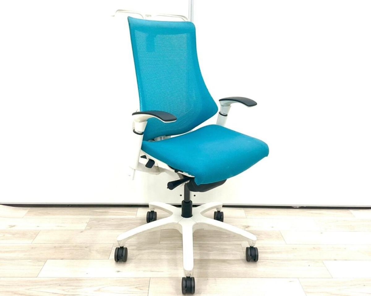 【姿勢の変化にフレキシブルに対応!スタイリッシュで座り心地も抜群な高機能チェア】■イトーキ(ITOKI)製 エフ(f)チェア 肘付き ハイバック 背面メッシュ ■可動肘・ハンガー付 ■ストロングブルー×ホワイトシェル ※日焼け有