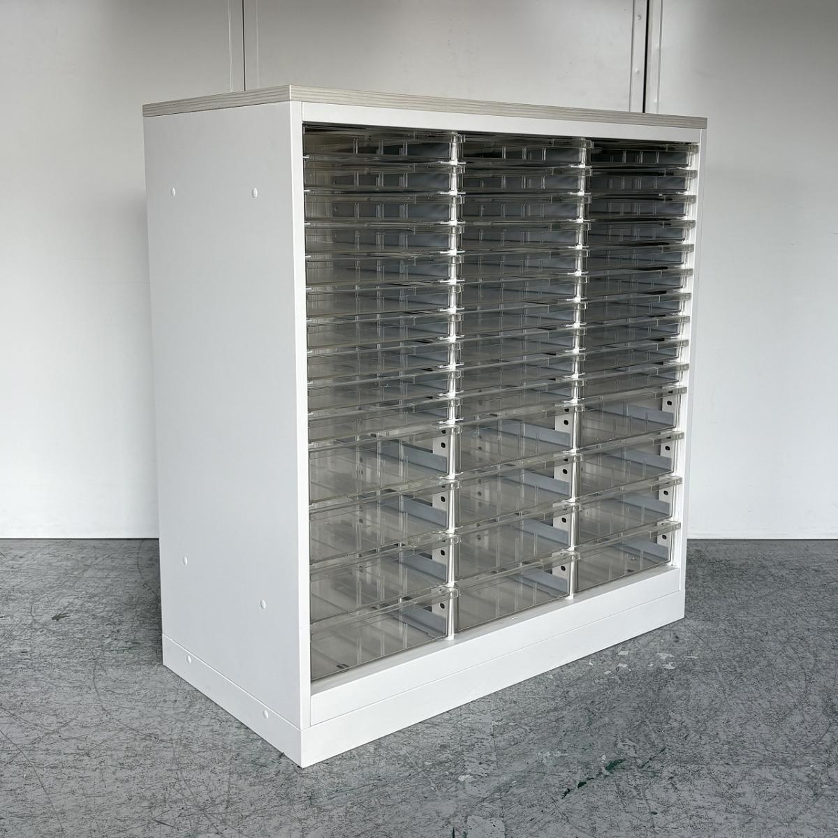 【書類・備品整理の必需品!】【珍しいクリトレが入荷!3列×浅型11段+深型5段】■イトーキ(ITOKI)製 シンラインシリーズ クリスタルトレー ローキャビネット ■3列×浅型11段+深型5段 ■天板・ベース付 ■色:ホワイト