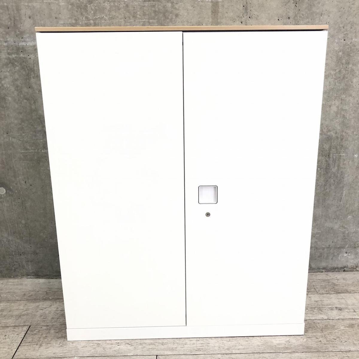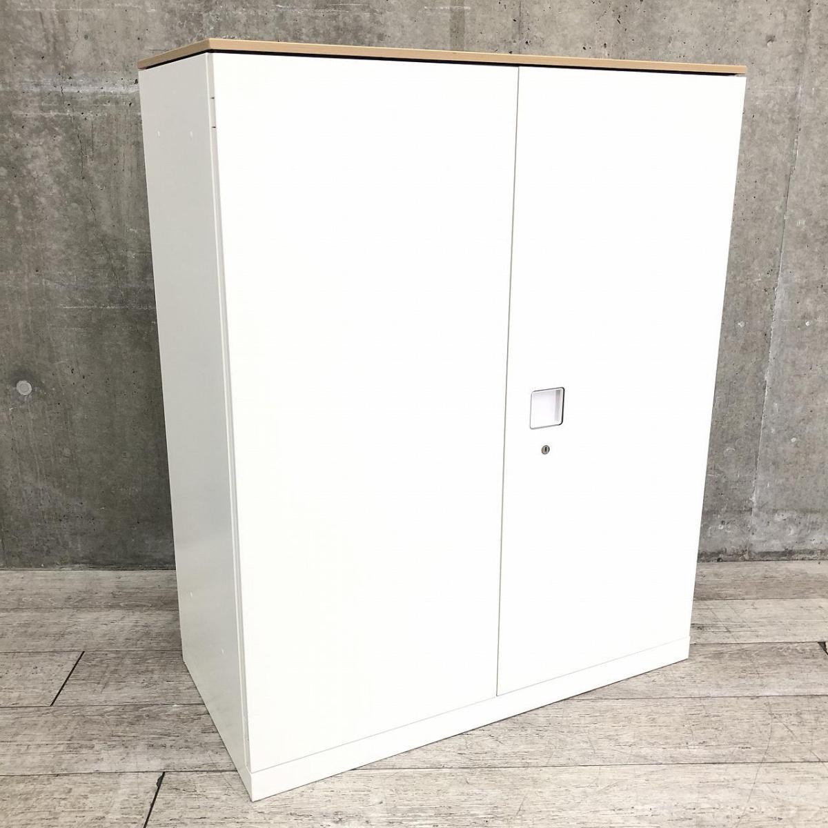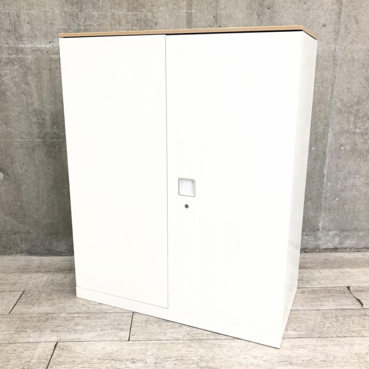 【オフィスの書類をスッキリ整理!取っ手がどの方向からでも開くマルチハンドル!】■オカムラ(okamura)製 レクトラインシリーズ 両開き書庫 ローキャビネット H1150㎜ ■ホワイト/天板:木目ナチュラル ■シリンダー錠【弊社使用欄:A01043444】【KN】- 渋谷サテライト