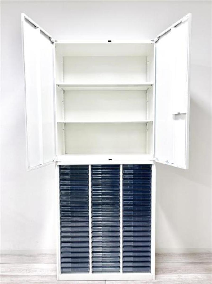 【在庫入替セール品】【定価約19万円】【書類の収納、仕分けに便利な下段クリスタルトレイの両開き書庫セット!】■オカムラ/レクトライン■上段両開き+下段クリスタルトレイ(浅のみ)■在庫がある店舗一覧