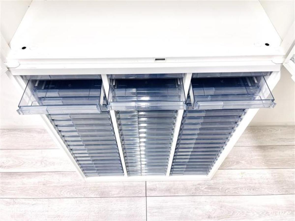 【両開きタイプで一見確認+最上段のみ浅型のクリスタルトレーのコンビ書庫!】■オカムラ製 レクトライン 上下書庫セット(上:両開き 下:クリスタルトレー)ホワイト 《オフィスバスターズ福岡博多店は、福岡を拠点として、日本全国へ中古オフィス用品・オフィス家具を提供しております》