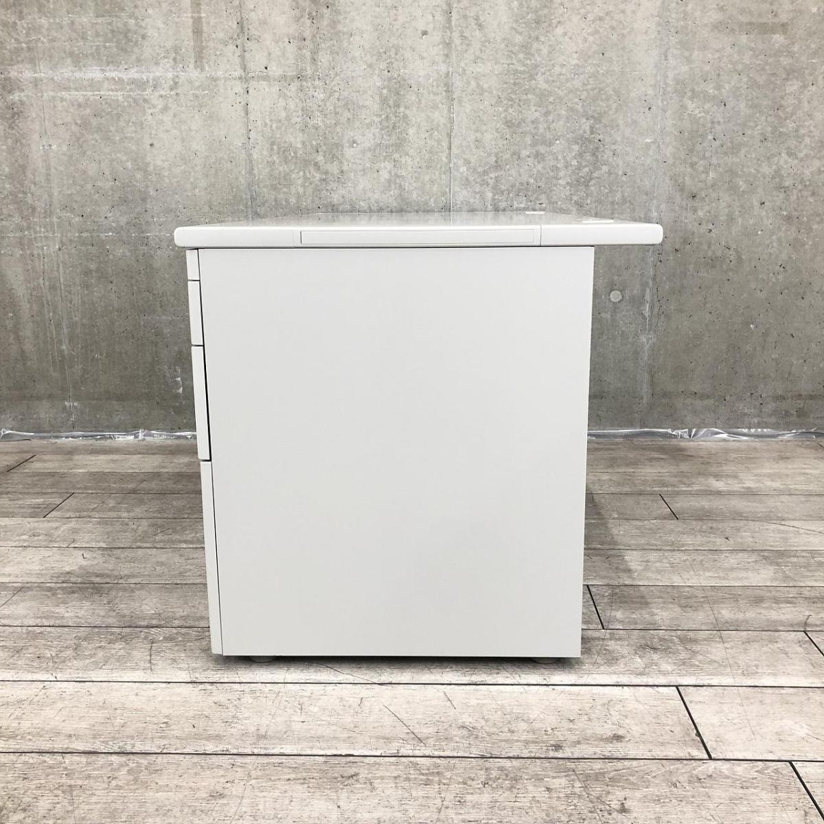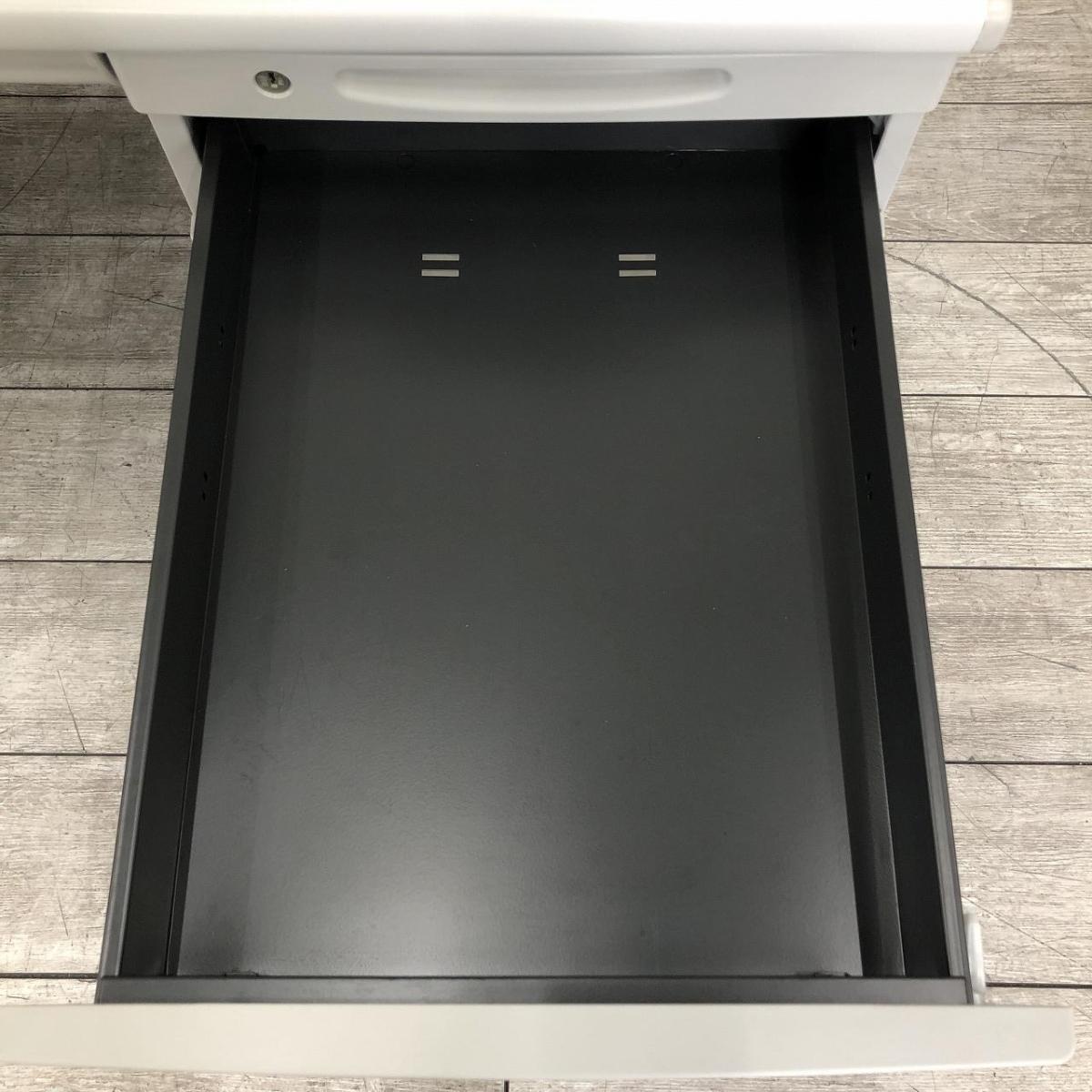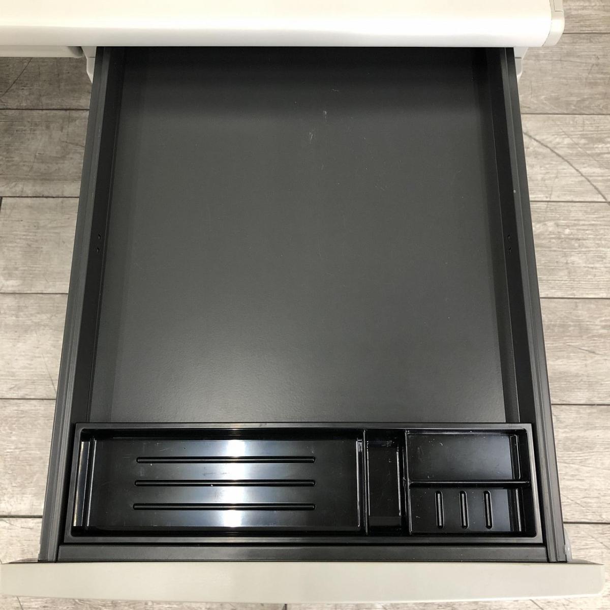 - 袖机のワゴンは、最下段がロング引出しになっており、従来より収納力120%アップ。