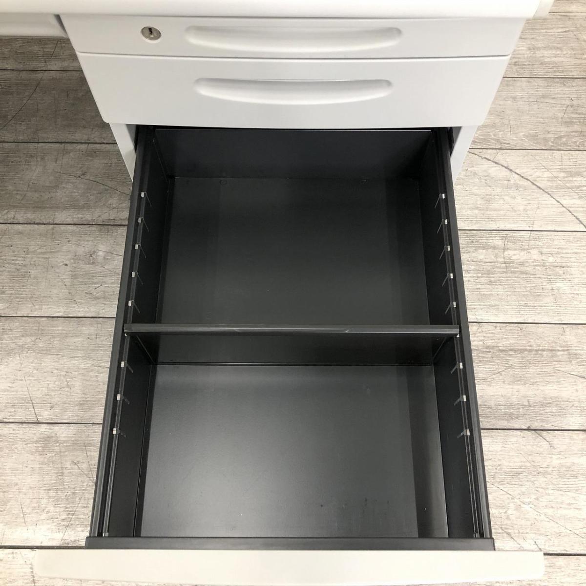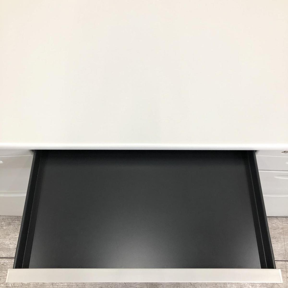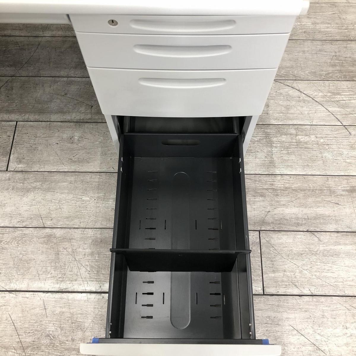 - 袖机のワゴンは、最下段がロング引出しになっており、従来より収納力120%アップ。