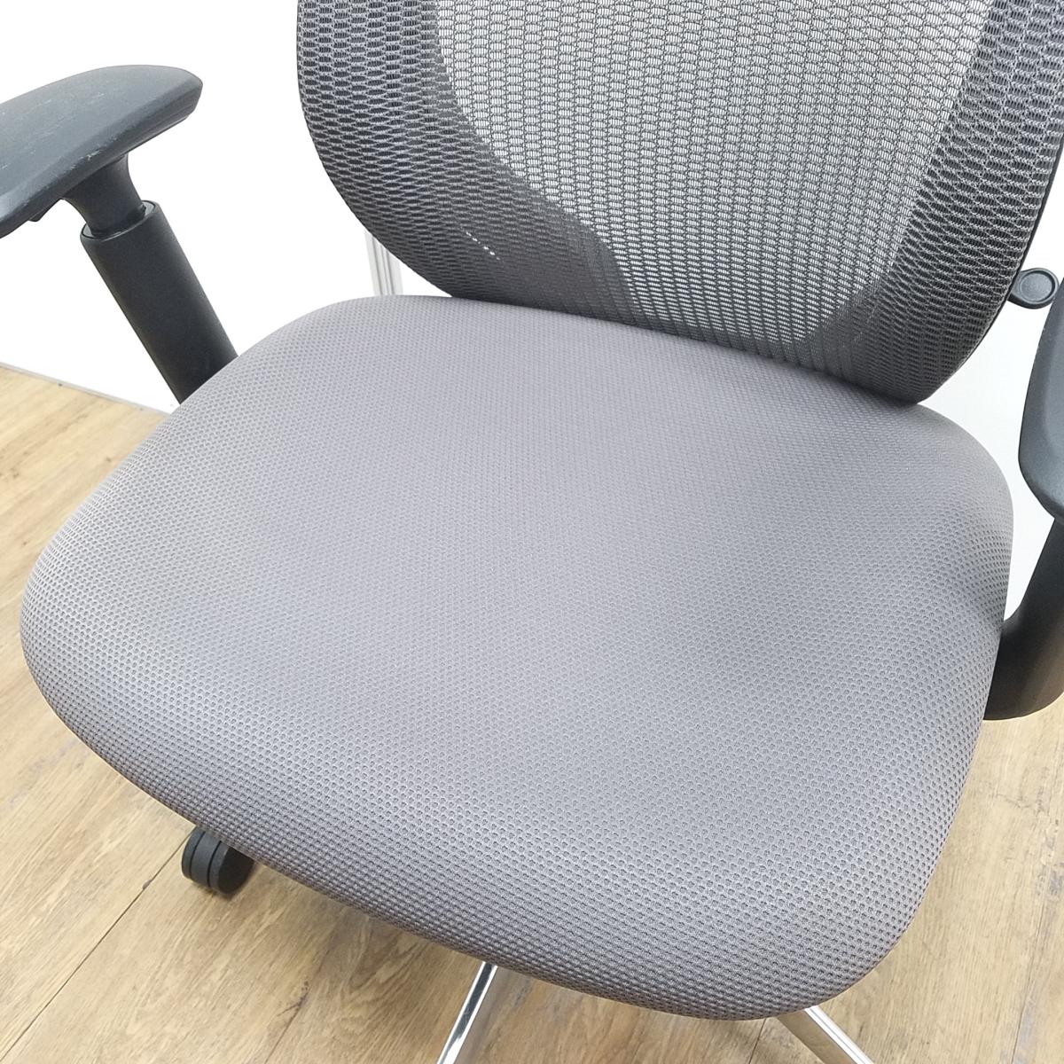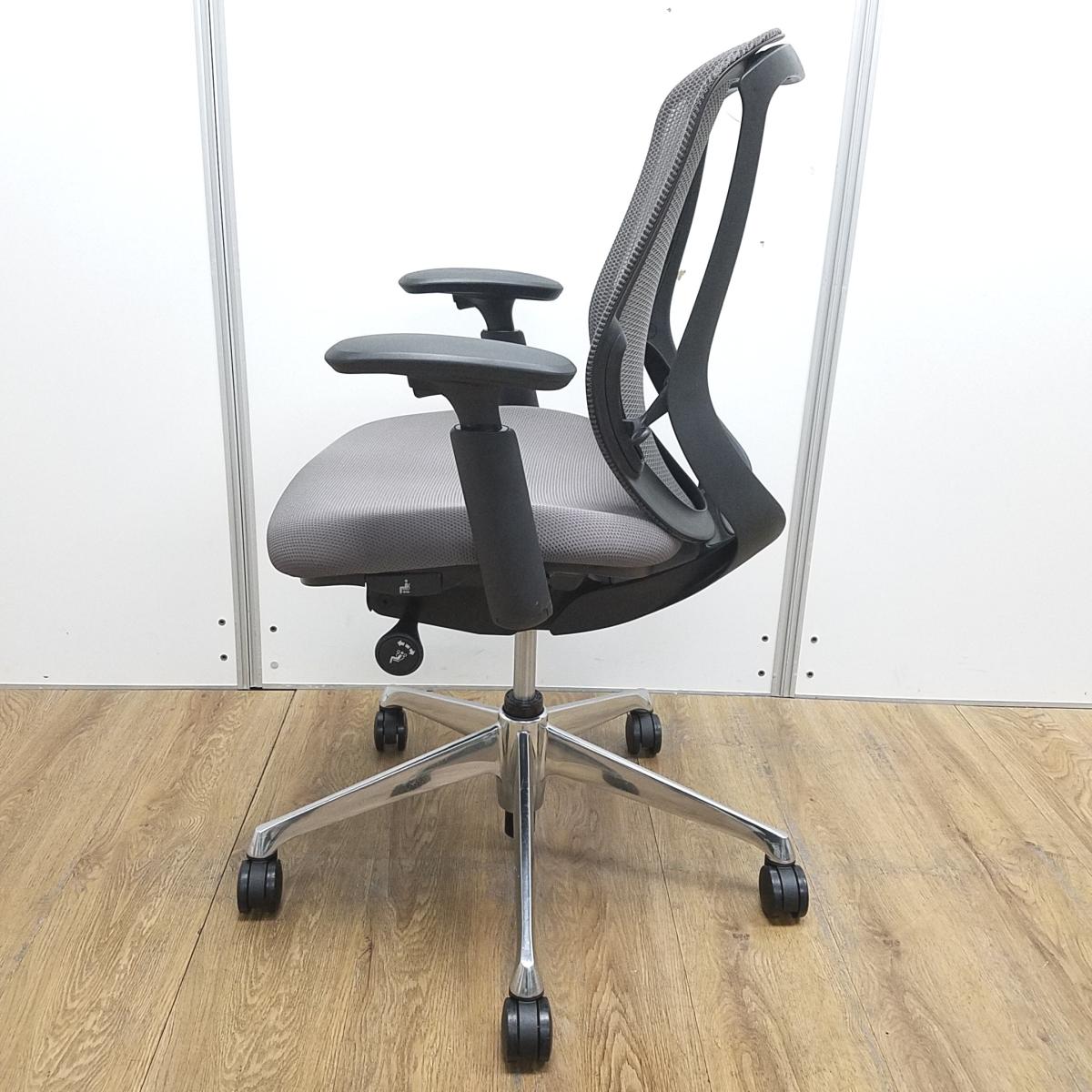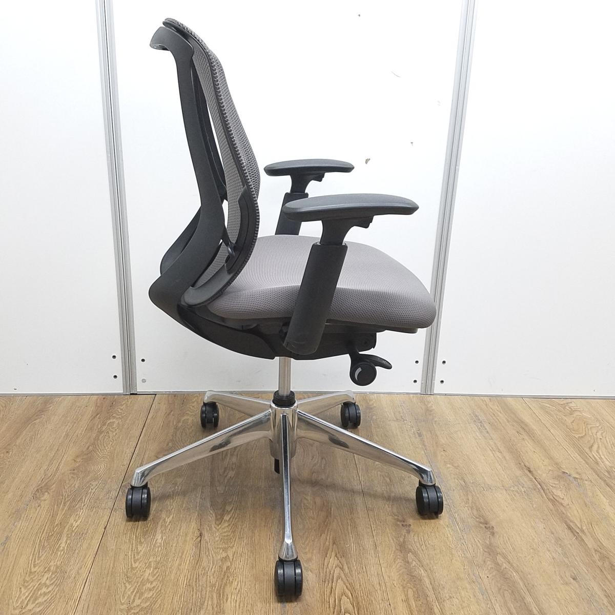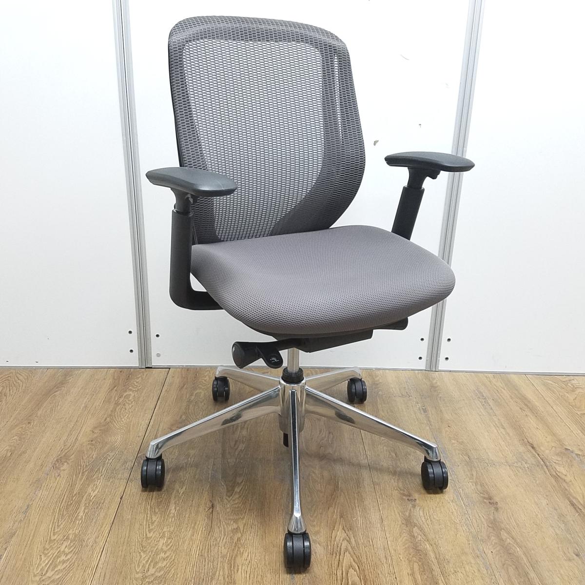 オカムラ製 シルフィ ミディアムグレー ブラックフレーム ローバック 背面メッシュ アジャストアーム※可動肘 ポリッシュ脚 前傾チルト機能付き オカムラ製品で最も人気を集める高機能メッシュチェア! 肘付きローバックチェア!!- 京都東寺店
