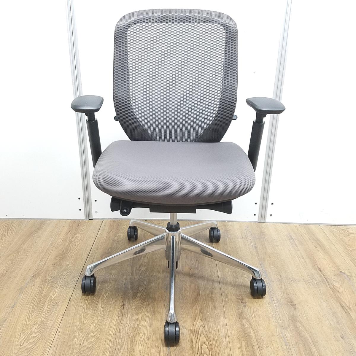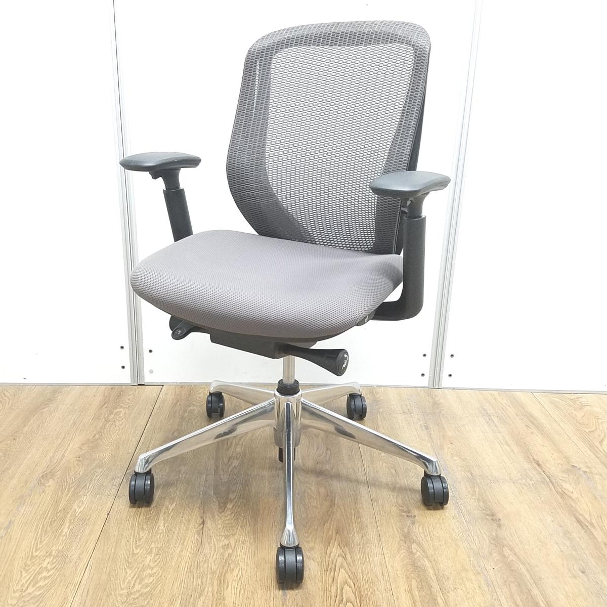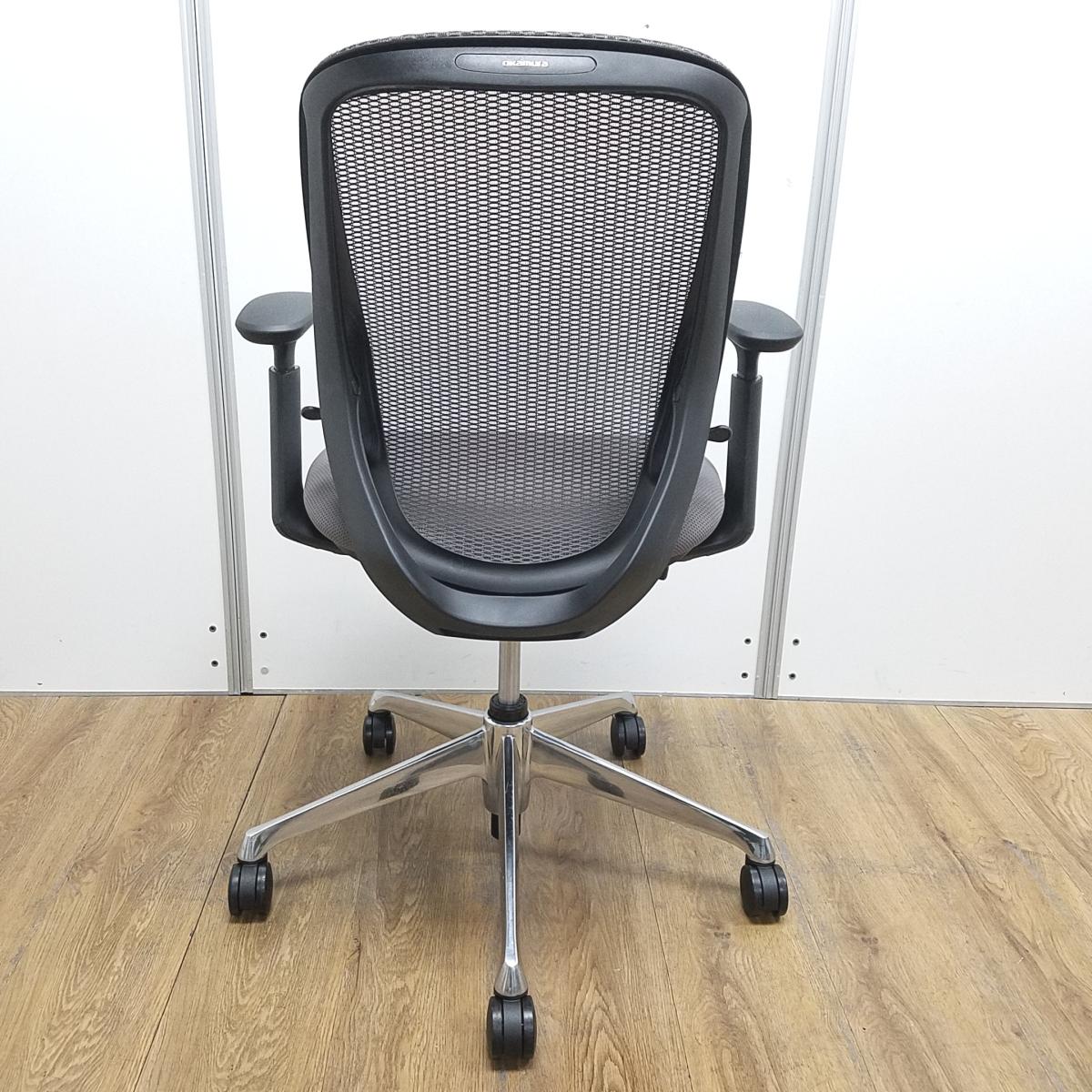 オカムラ製 シルフィ ミディアムグレー ブラックフレーム ローバック 背面メッシュ アジャストアーム※可動肘 ポリッシュ脚 前傾チルト機能付き オカムラ製品で最も人気を集める高機能メッシュチェア! 肘付きローバックチェア!!- 京都東寺店
