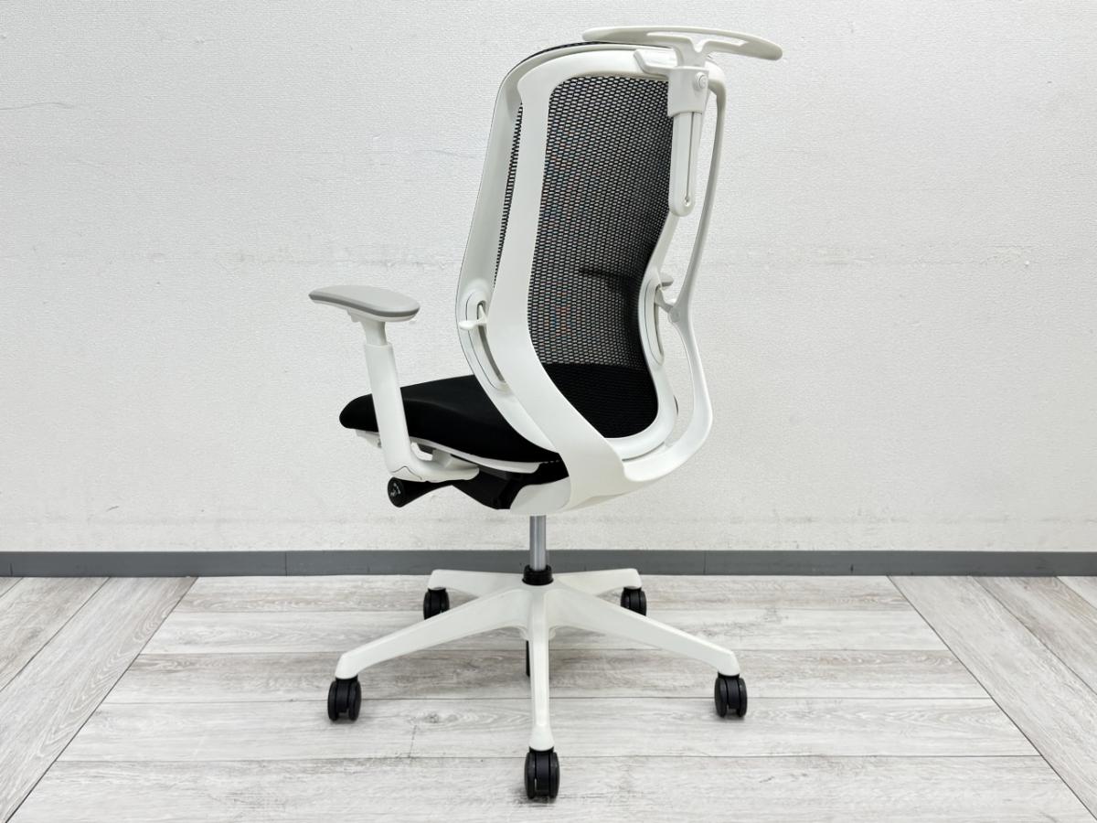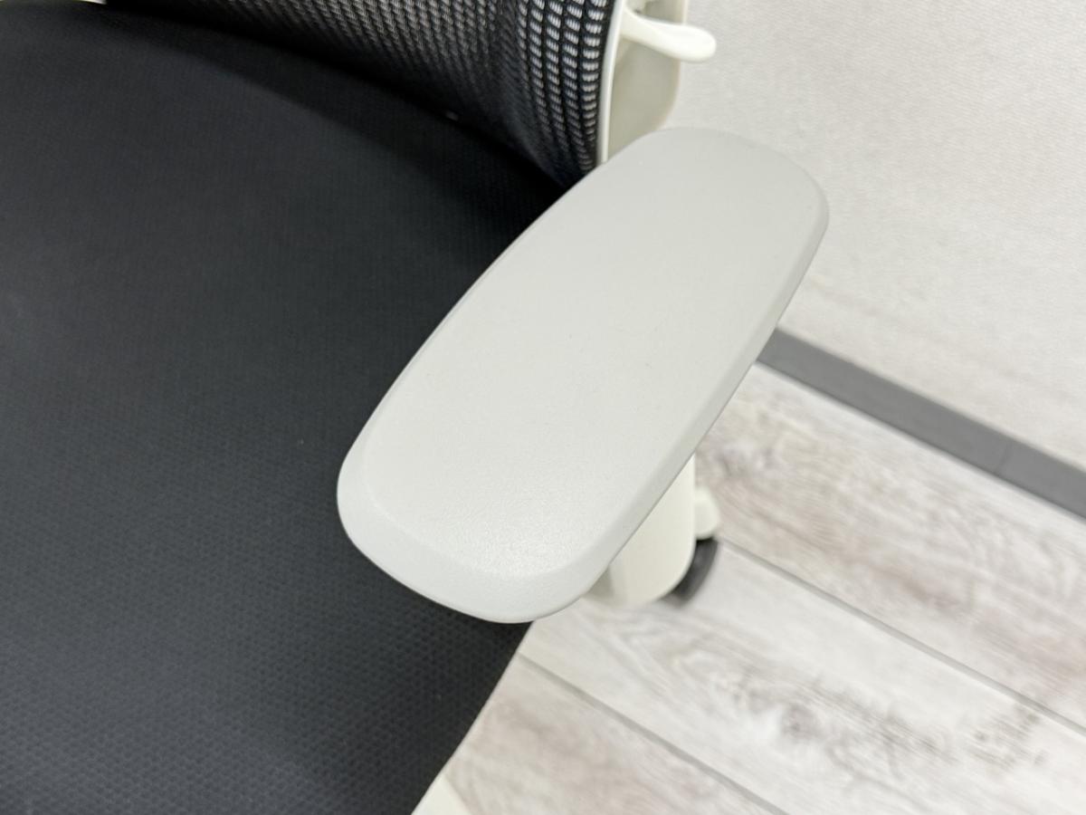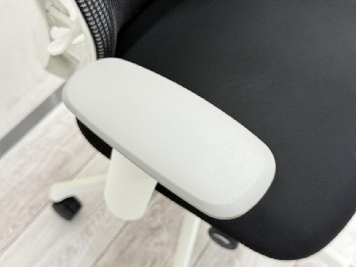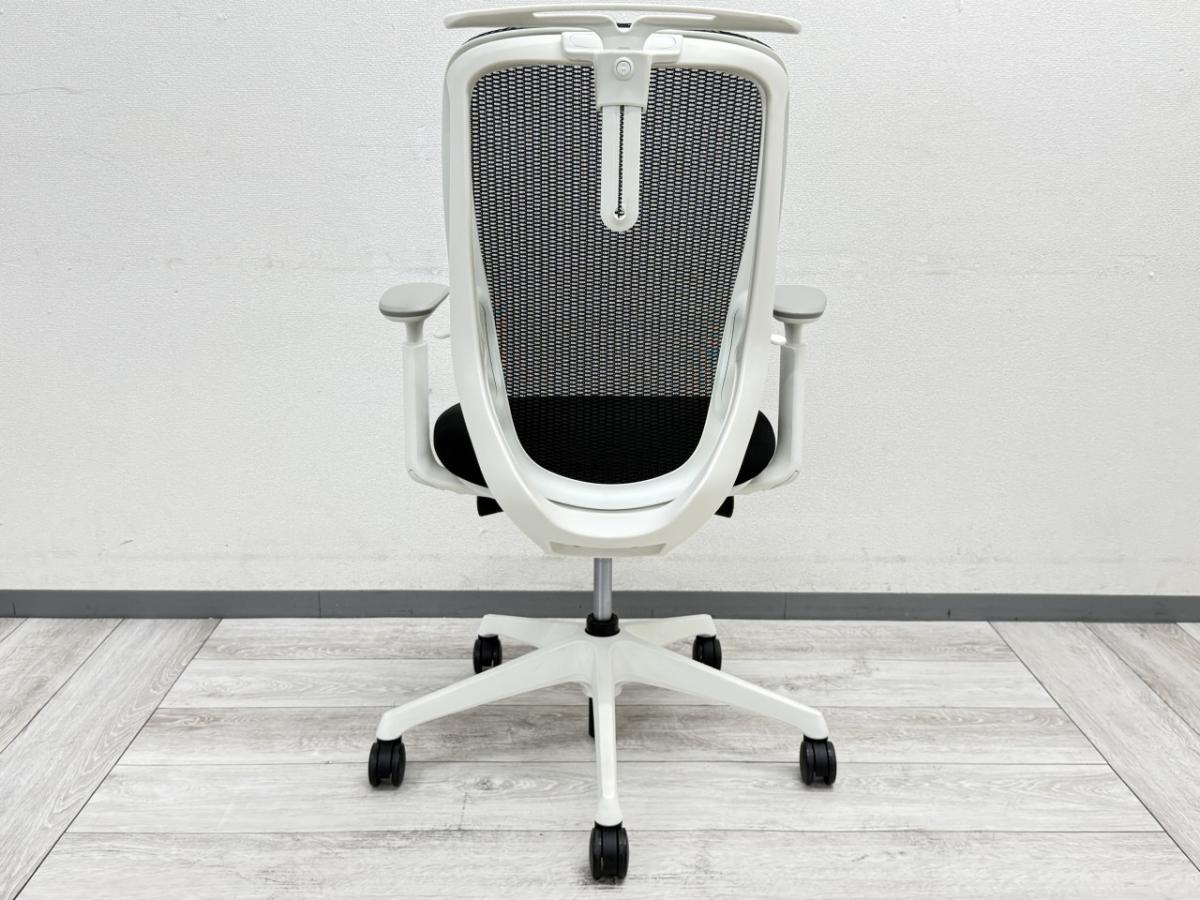 ハイバックのブラック張地×ホワイトフレームに、背面ハンガーを備えた肘付きワークチェアです。2022年製の現行系統で、メッシュ背が熱を逃がし、座はしっかりめのクッションで体圧を安定させます。可動肘とガス昇降で体格や姿勢に合わせやすく、執務から会議まで幅広く使える一脚です。
