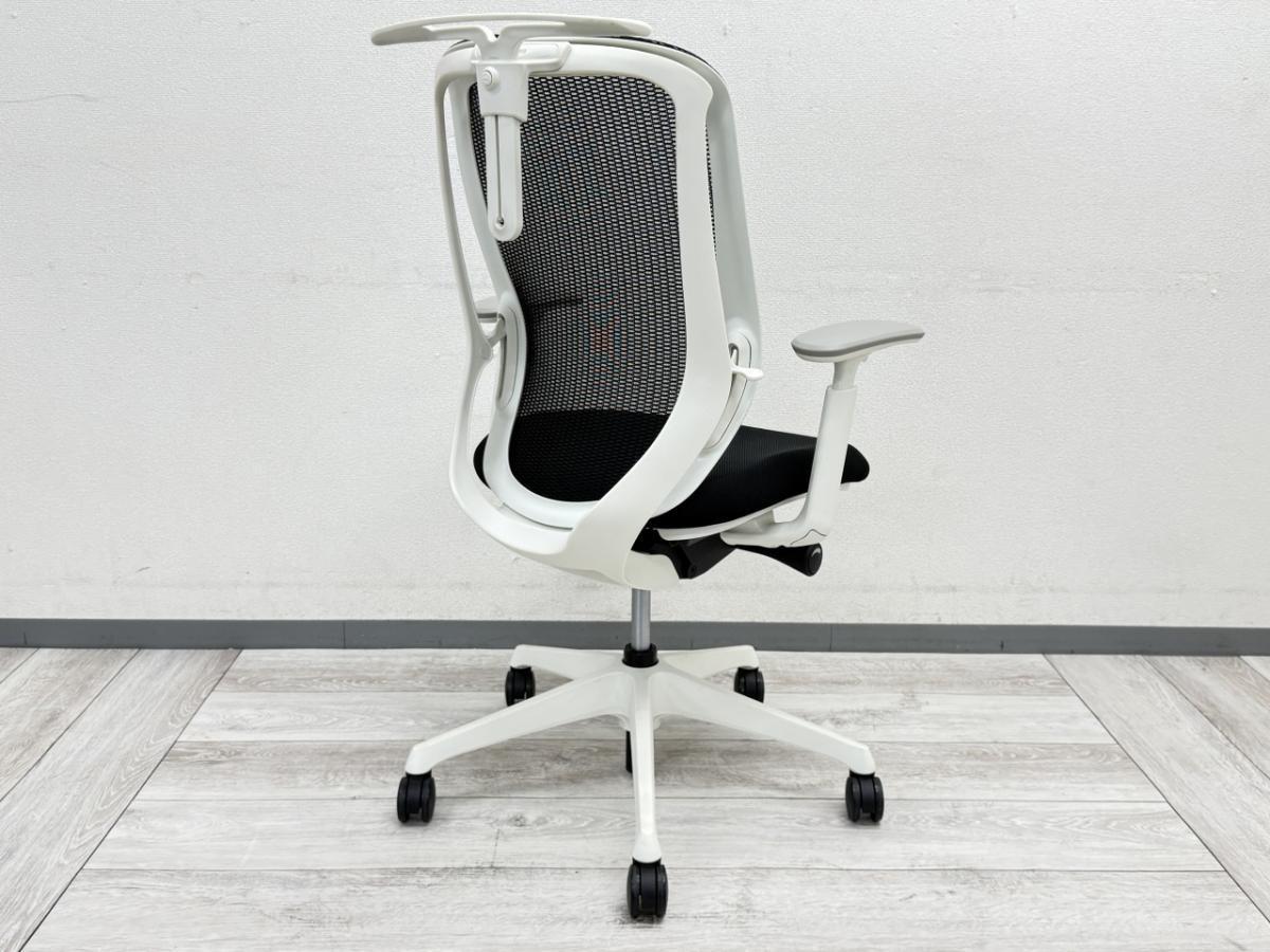 ハイバックのブラック張地×ホワイトフレームに、背面ハンガーを備えた肘付きワークチェアです。2022年製の現行系統で、メッシュ背が熱を逃がし、座はしっかりめのクッションで体圧を安定させます。可動肘とガス昇降で体格や姿勢に合わせやすく、執務から会議まで幅広く使える一脚です。
