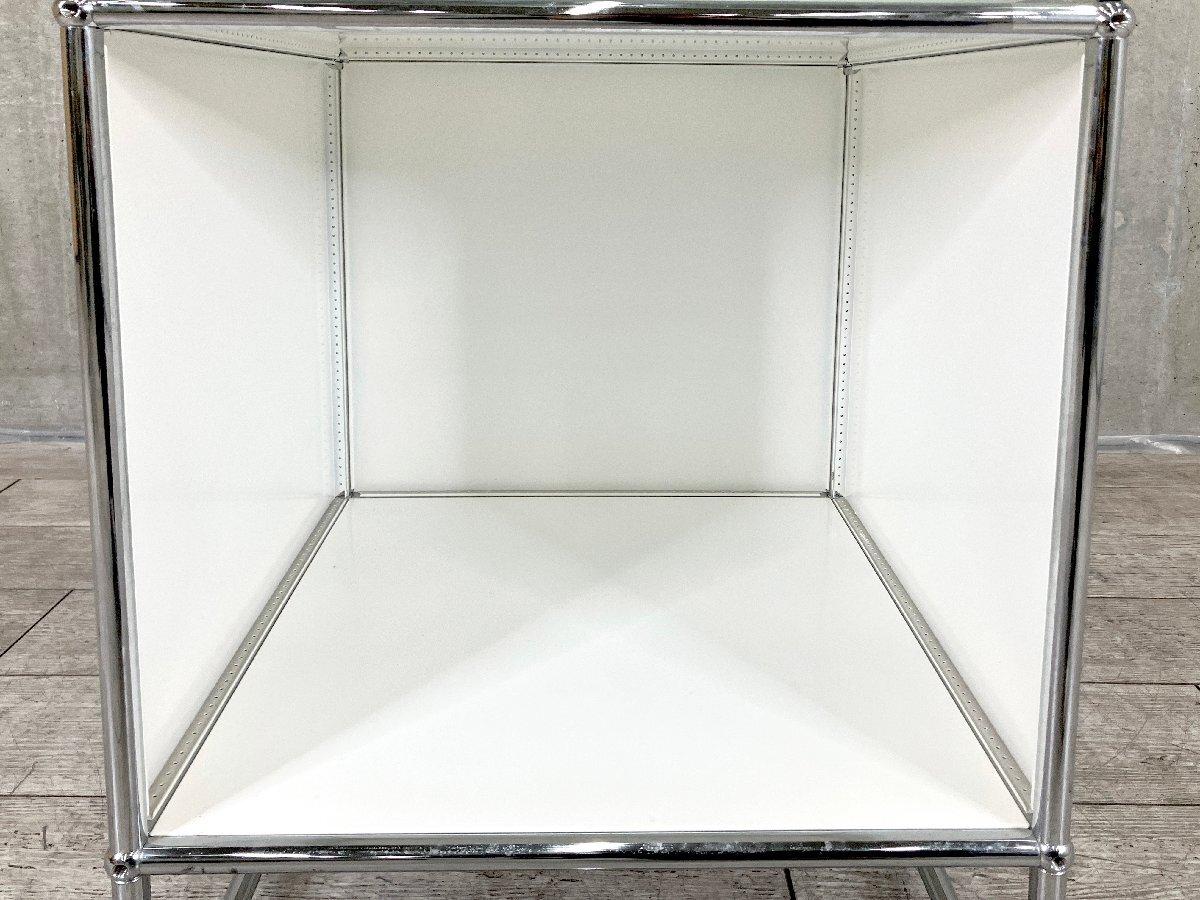 均整のとれた500mm角のキューブに、クロームフレームとホワイトパネルが軽やかな印象を添えています。 天板には厚みのあるクリアガラスを採用しており、置いた照明や小物の佇まいがそのまま引き立つ、透明感のある仕上がりが特徴です。 ベッドサイドはもちろん、リビングのサイドテーブルとしても使いやすいサイズ感。 下部のオープンスペースには書籍やデバイス、トレーやバスケットなど、日常のアイテムがすっきり収まります。 長年にわたり仕様変更をほとんど行わないUSMならではの、普遍的な美しさと堅牢性を備えた一台です。