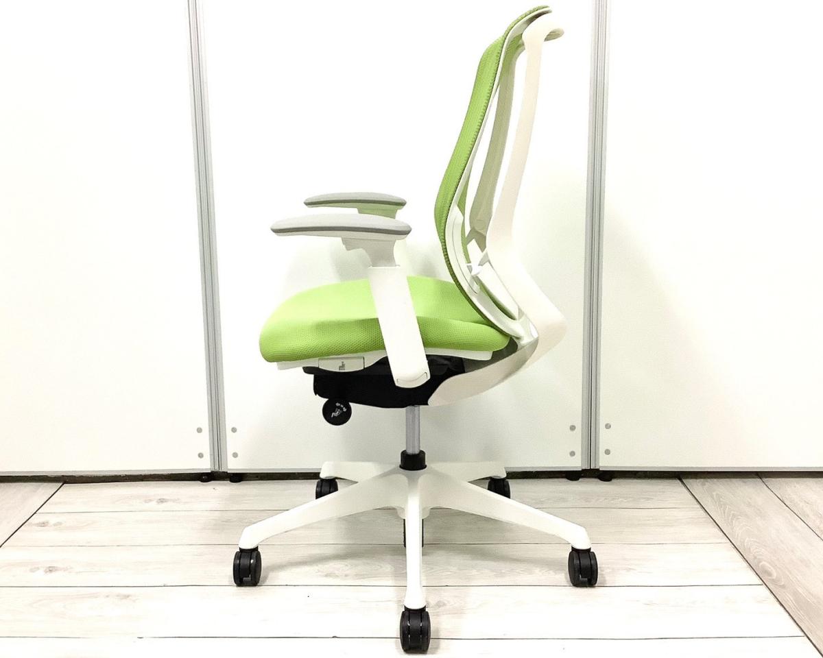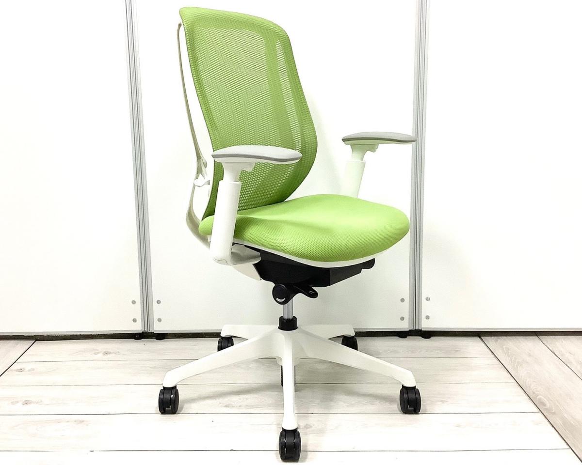 【前傾チルト機能付き!オカムラ製品で最も人気を集める高機能メッシュチェア!】■オカムラ(okamura)製 シルフィ(Sylphy)チェア ハイバック 肘付き ■可動肘 ■ライムグリーン × ホワイトシェル【状態良好品!】