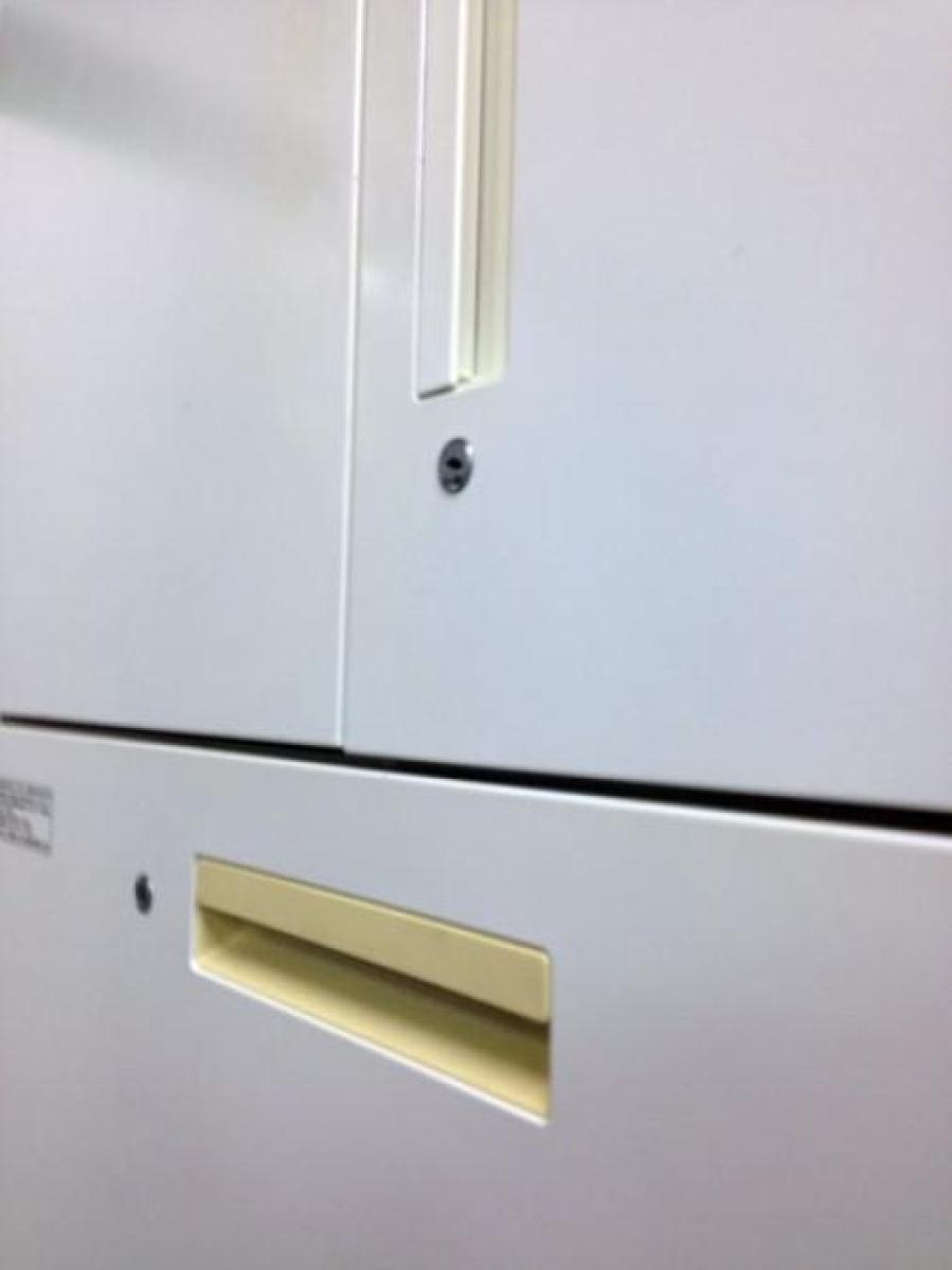 【把手部分日焼けありのため特価】◆ウチダ/HS 観音開き+3段引き出し 書庫 ハイキャビネット 博多 天神《オフィスバスターズ福岡博多店は、福岡を拠点として、日本全国へ中古オフィス用品・オフィス家具を提供しております》