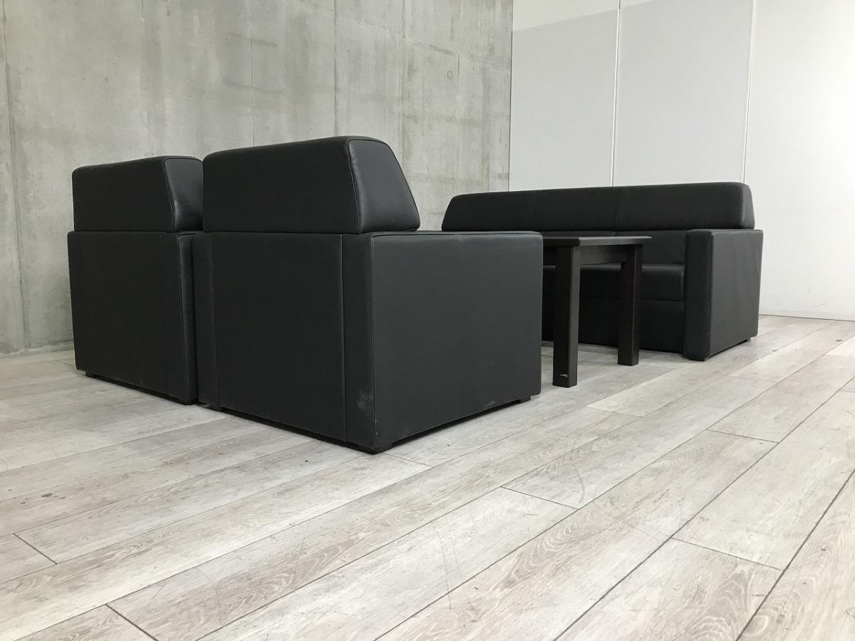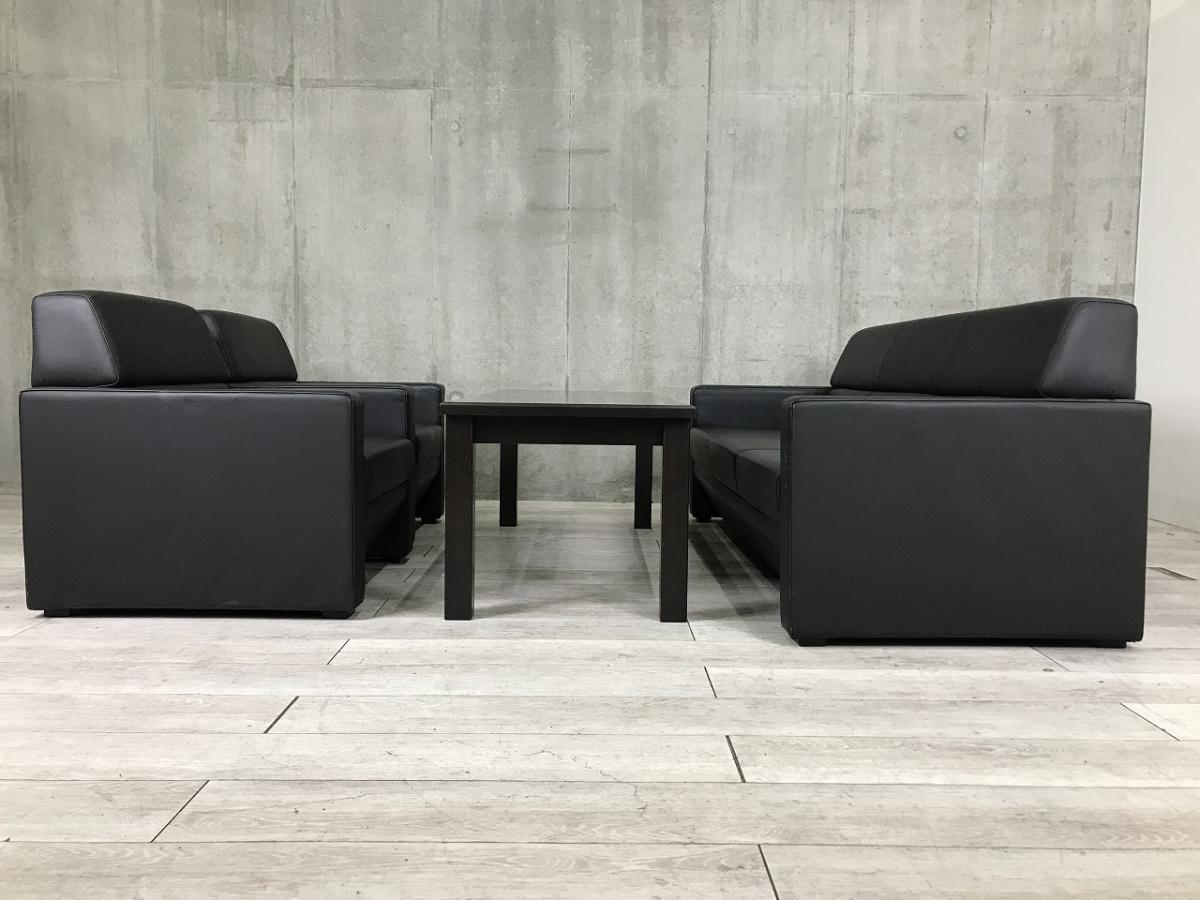 【高級感溢れるレザー生地!ミドルクラスの応接セット!】■オカムラ(okamura)製 応接セット一式 / 1人用応接ソファ2台 & 3人用応接ソファ1台 & センターテーブル ■ソファー(レザー張地):ブラック/テーブル:木目ブラウン- 春日部・越谷店
