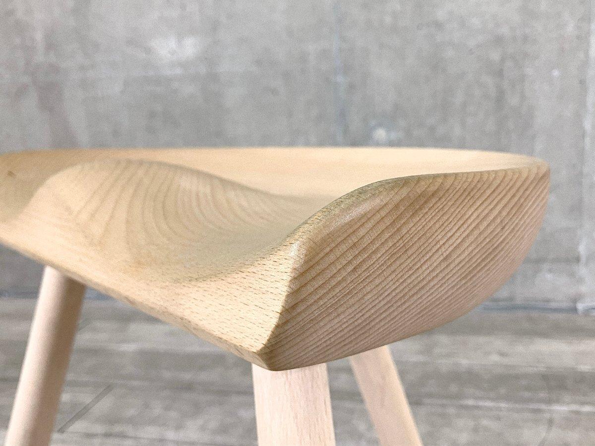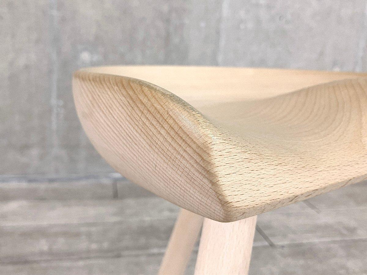 座面は職人の手彫りによって、お尻に沿うように滑らかに削り出されており、見た目のシンプルさに反して、しっかりと身体を支えてくれる安定した座り心地を実現しています。 3本脚の軽やかな構造は、視覚的な軽さと、どこにでも気軽に持ち運べる使い勝手の良さが魅力です。
