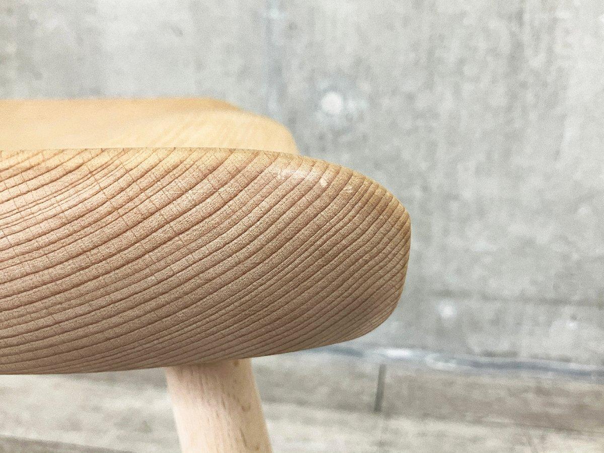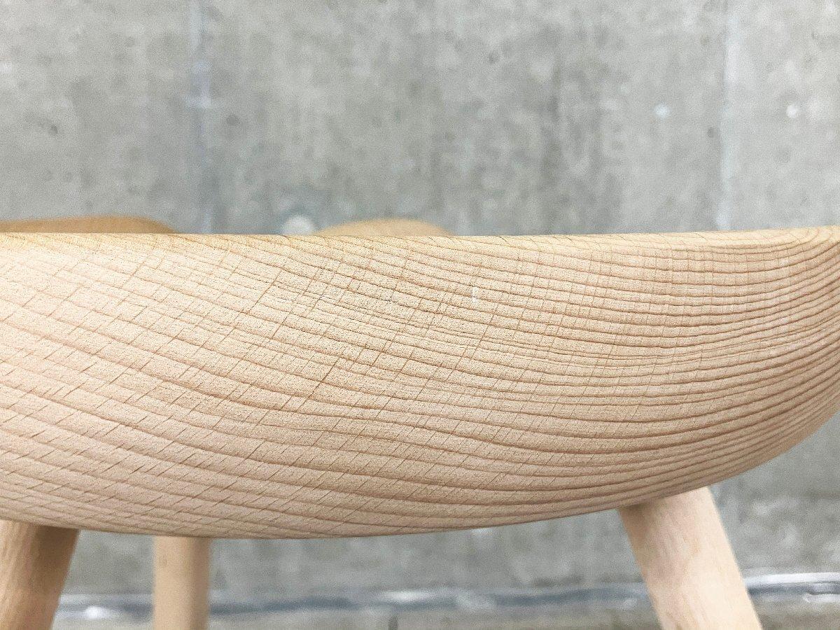 座面は職人の手彫りによって、お尻に沿うように滑らかに削り出されており、見た目のシンプルさに反して、しっかりと身体を支えてくれる安定した座り心地を実現しています。 3本脚の軽やかな構造は、視覚的な軽さと、どこにでも気軽に持ち運べる使い勝手の良さが魅力です。