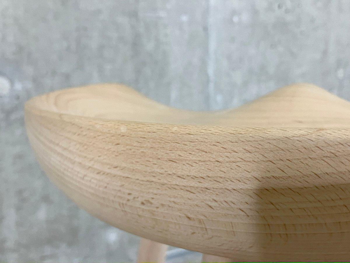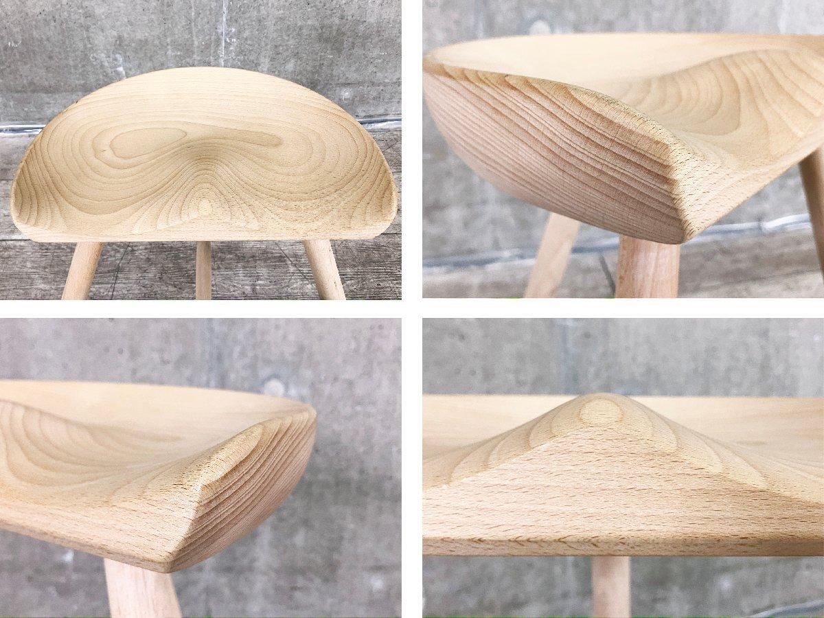 座面は職人の手彫りによって、お尻に沿うように滑らかに削り出されており、見た目のシンプルさに反して、しっかりと身体を支えてくれる安定した座り心地を実現しています。 3本脚の軽やかな構造は、視覚的な軽さと、どこにでも気軽に持ち運べる使い勝手の良さが魅力です。
