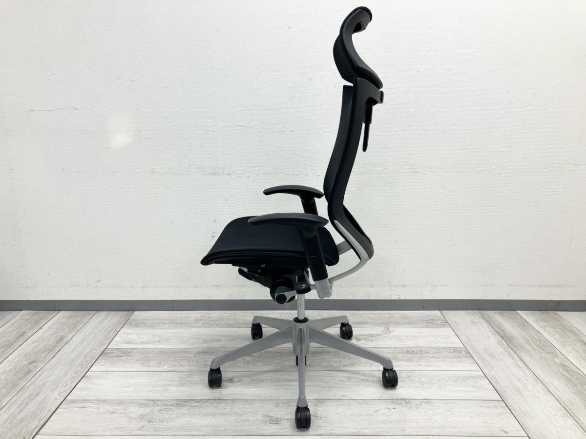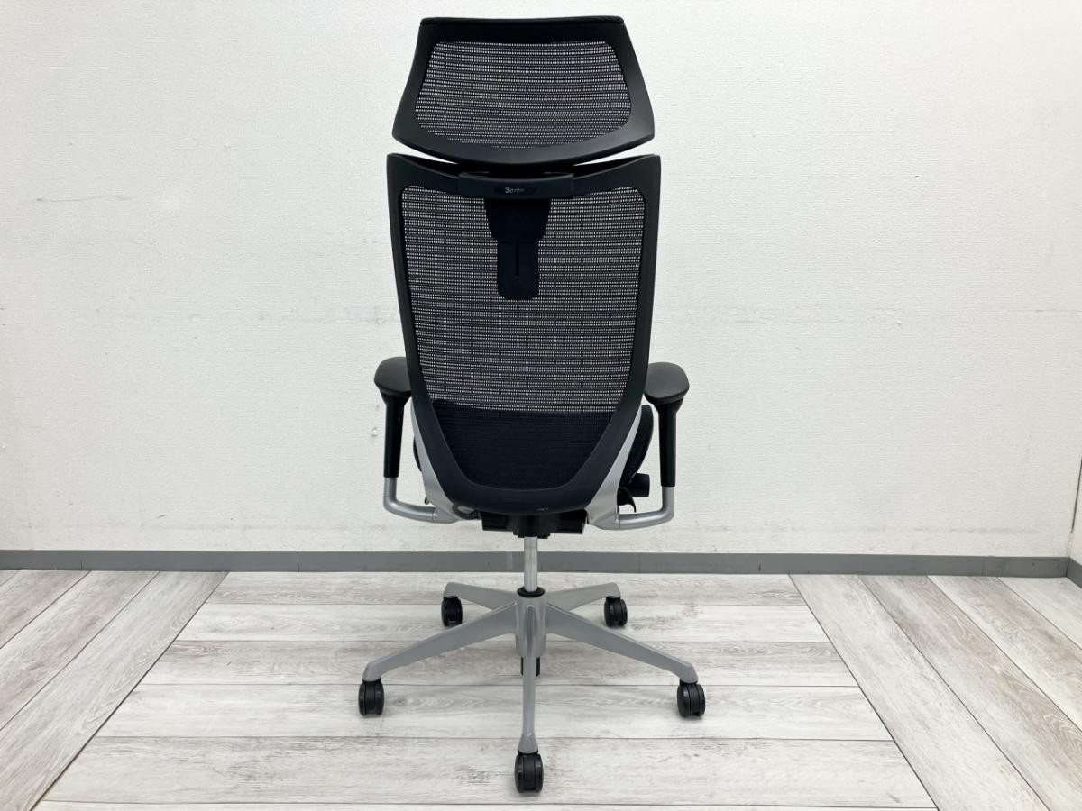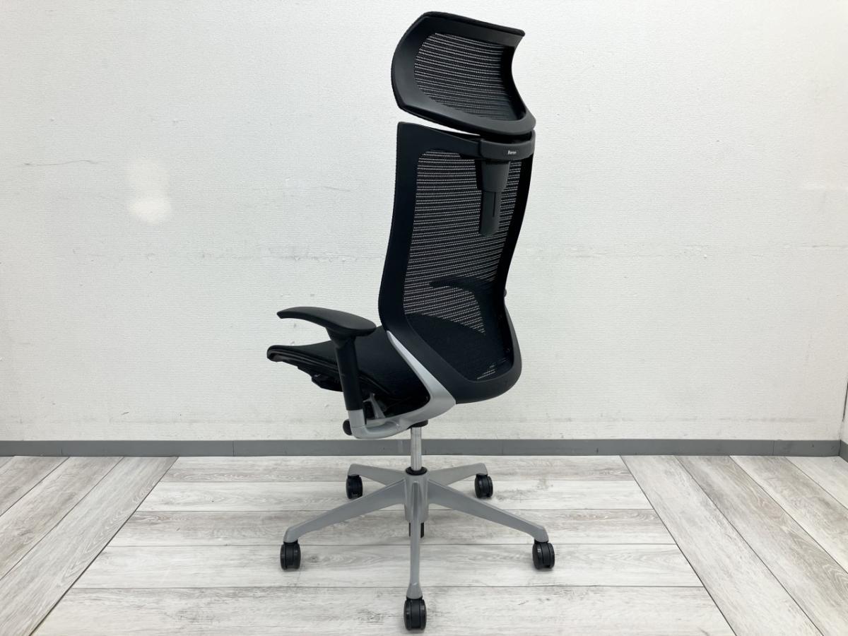 オカムラ製の人気高機能チェア「バロンチェア(Baron)」です。背・座ともに通気性に優れたメッシュ仕様で、長時間の使用でも快適な座り心地を維持します。ヘッドレスト付きのハイバックタイプで、首から腰までをしっかり支え、正しい姿勢を自然にサポートします。