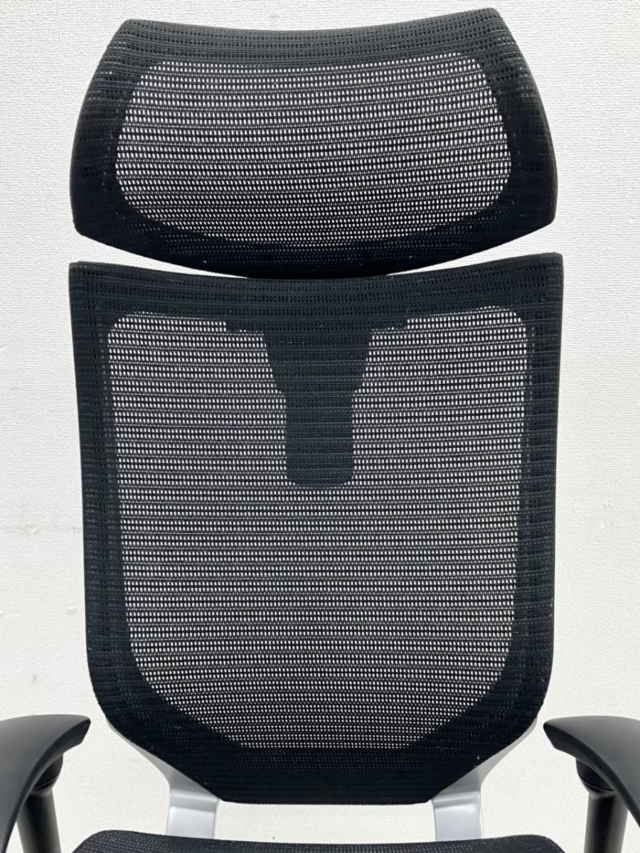 【2018年製】オカムラ バロンチェア エクストラハイバックモデル 座:メッシュ 背:メッシュ シルバーフレーム アジャストアーム 可動ヘッドレスト搭載 ※座面ヨレあり