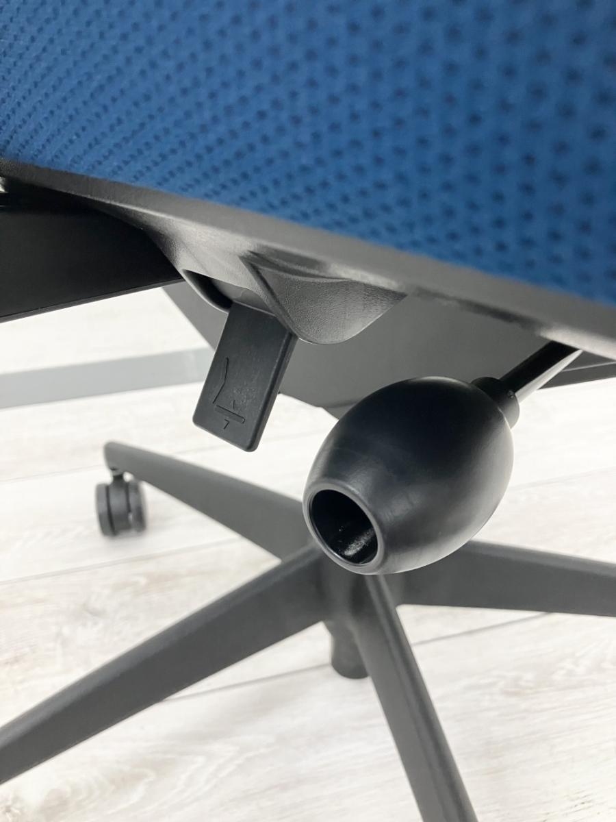 座面のクッションは適度な弾力があり、体重を分散して安定した座り心地を実現。可動式のアジャスタブル肘は高さ調整が可能で、作業姿勢に合わせたサポートができます。背もたれはロッキング機構付きで、体を預けたときのリラックス姿勢にも対応。シンプルながらも機能性の高い1脚です。