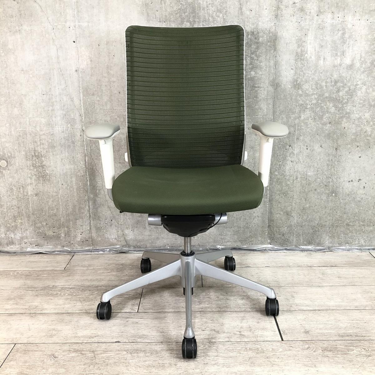 ★【T10】【商品入替のため、残り1脚限り】オカムラ製 コーラル(Choral) ライムグリーン ホワイトシェル ハイバック 肘付き メッシュ背面 アジャストアーム※可動肘 ハンガー付 どんな空間にも調和するデザインと最上級の操作性! 肘付きハイバックチェア!!【管理番号:A01024742】