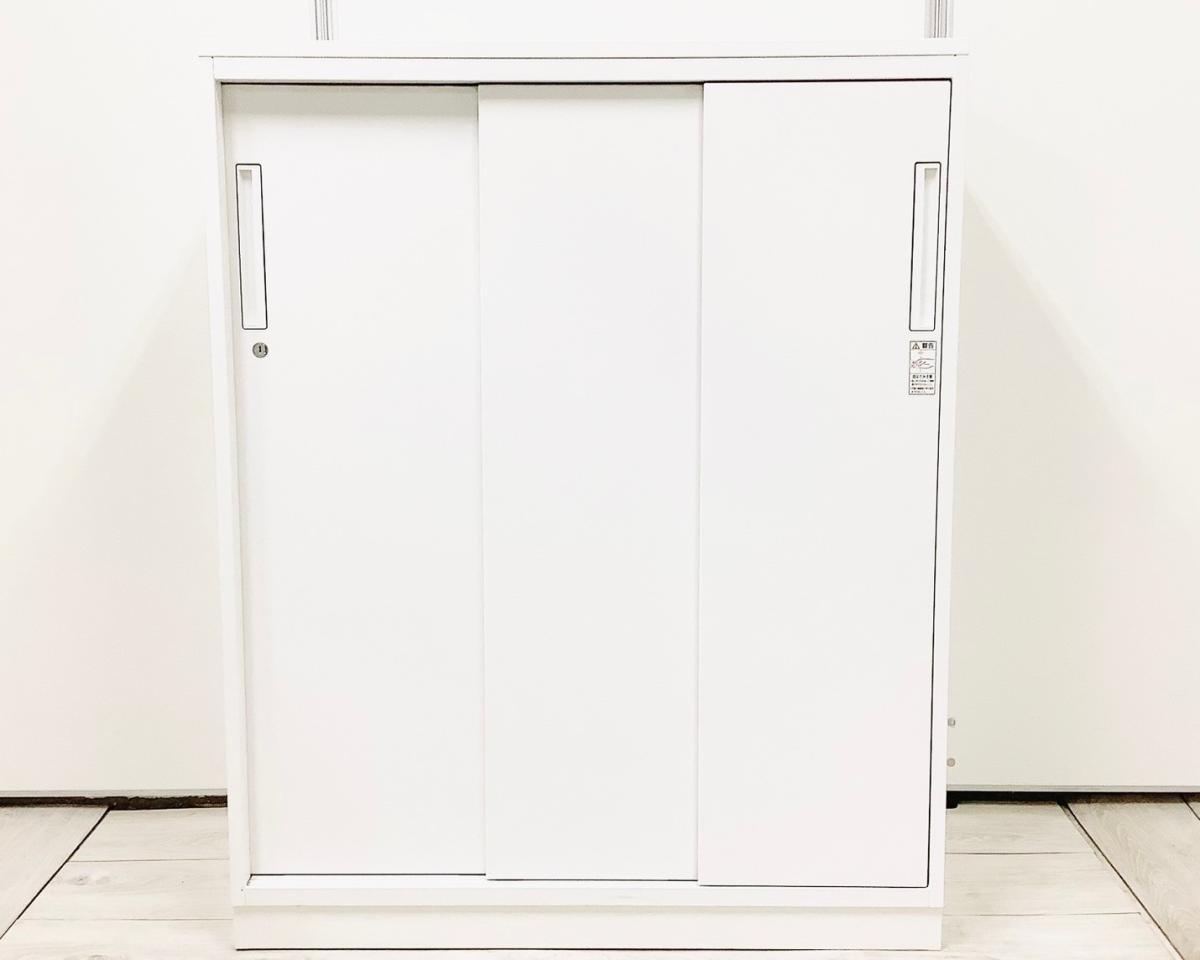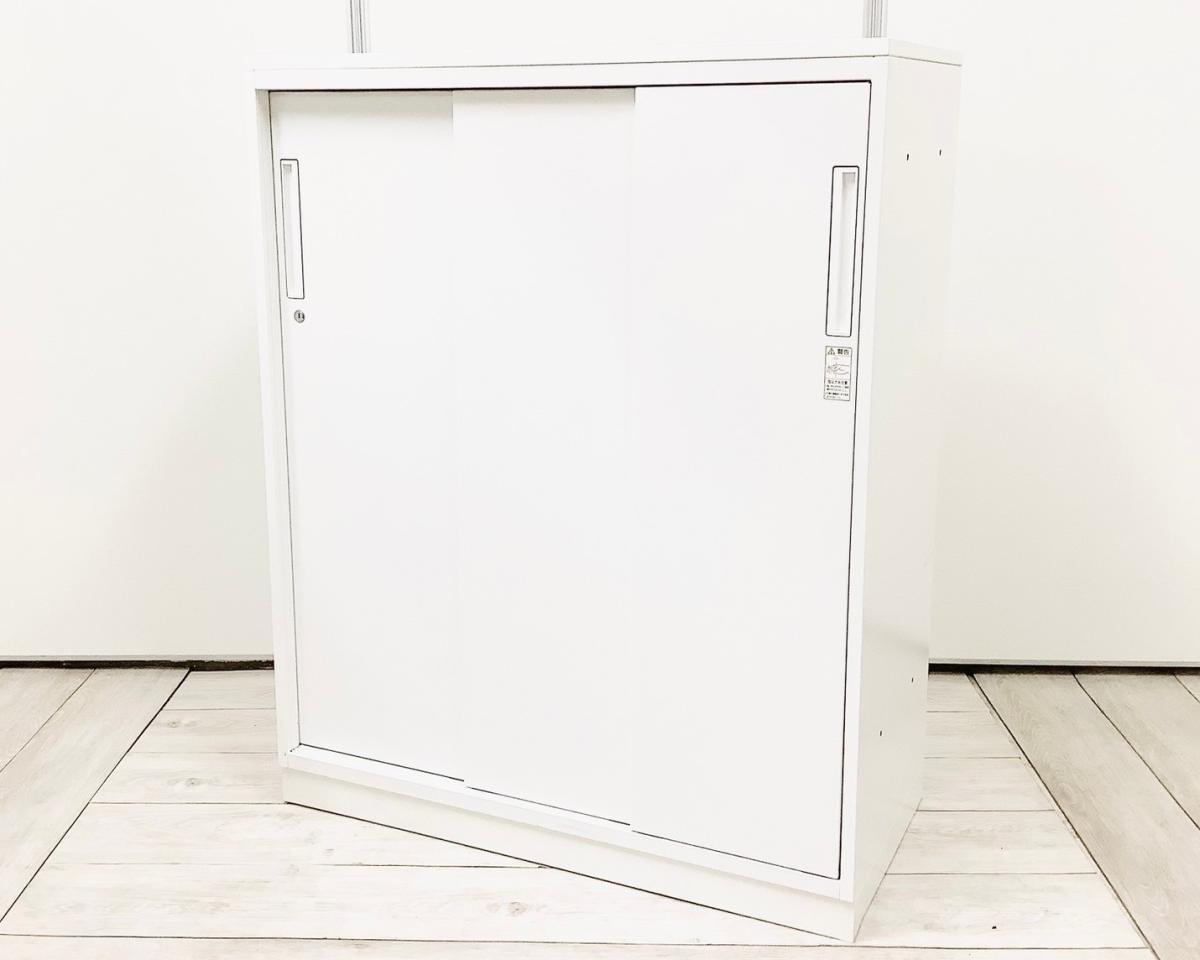 【スライド引き戸だから開閉スペースに困らない!】■コクヨ(KOKUYO)製 エディア(EDIA)シリーズ 2枚引き違い書庫 ローキャビネット シリンダー錠 天板付き ベース付き ホワイト シリンダー錠 収納 中古家具 格安 福岡 オフィス家具 九州最大級《オフィスバスターズ福岡博多店は、福岡を拠点として、日本全国へ中古オフィス用品・オフィス家具を提供しております》