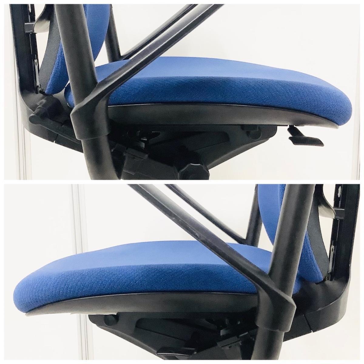 例えば、座面は、イトーキ独自の"ベンディングシート"という機構により、クッション、インターシェル、空洞という三層構造になっています。 この真ん中に挟まっているインナーシェルが、着座時の姿勢に合わせて体重を分散してくれるので、どんな姿勢でも体になじみ、疲労を軽減してくれます。 さらに、座面は前後に4センチほど奥行きを調整でき、前傾姿勢で座りたい、深く腰掛けたい、膝裏を圧迫されたくないなど、個人の好みに合った快適さにカスタマイズが可能となっています。