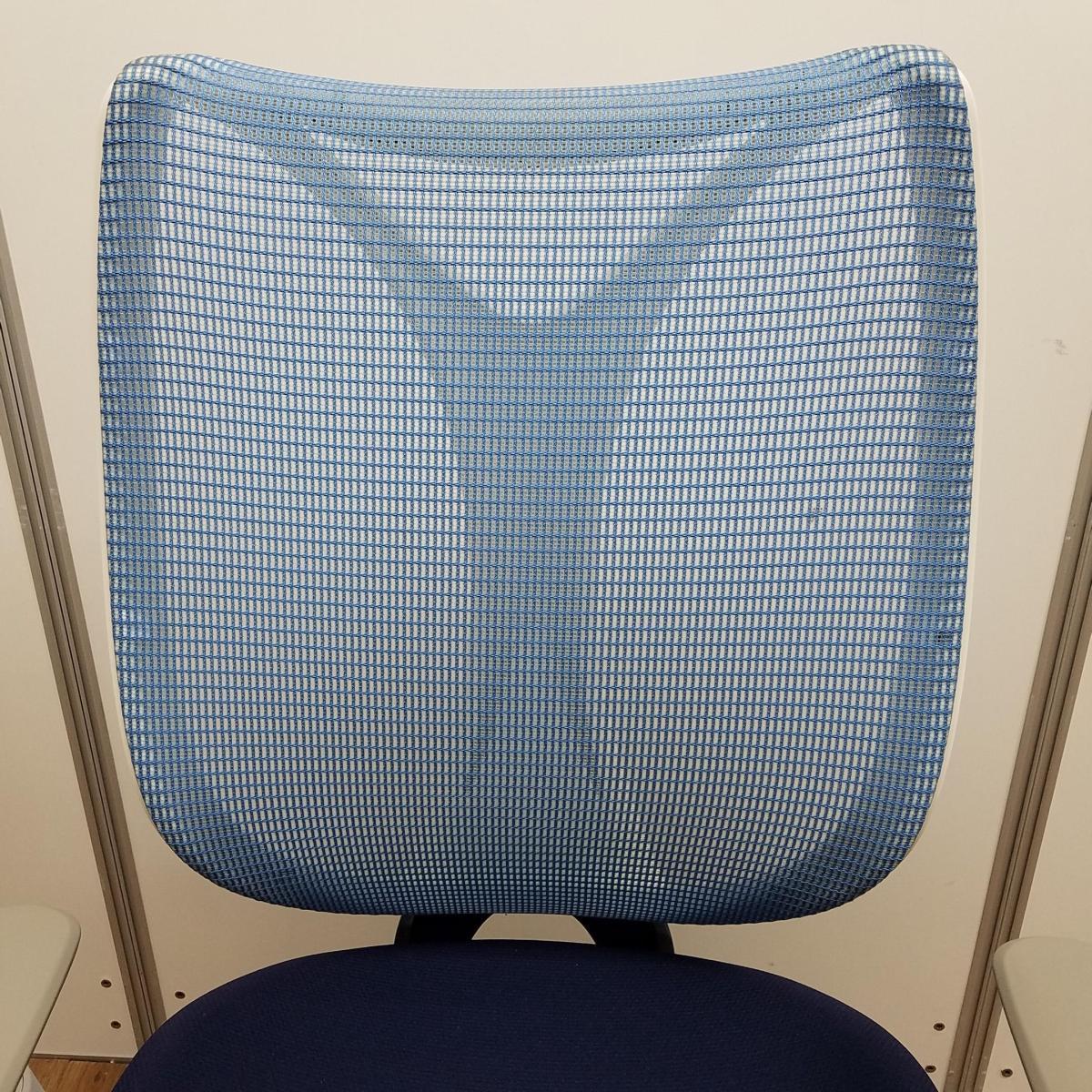 【T11】【T9】【K7】【商品入替のため、残り5脚限り】オカムラ製 サブリナシリーズ アクアブルー 背もたれ/アクアブルーx座面/ダークブルーのツートンカラー ホワイトフレーム アジャストアーム※可動肘 前傾チルト付 流れるような美しいフォルムの最高級メッシュチェア! 肘付きハイバックチェア!!サーキュラーバリューCO2削減量の算出について