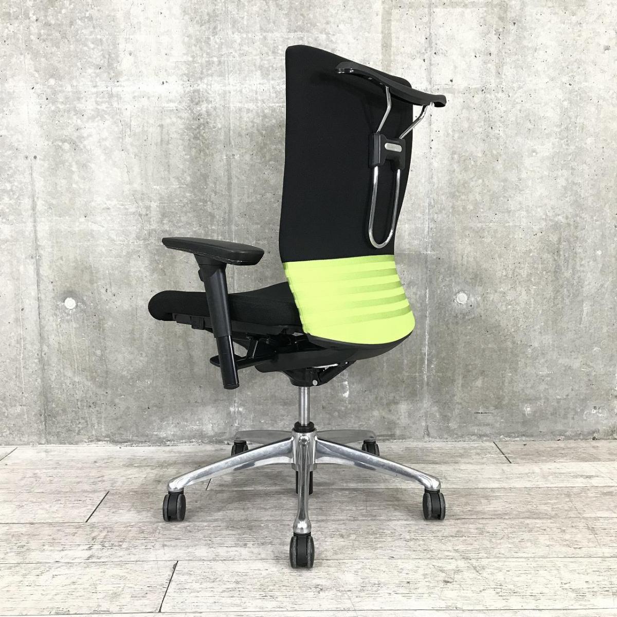 【背あてのしなやかな曲線が背中にフィット!快適な座り心地に高級感のあるデザインが人気!】■オカムラ(okamura)製 フィーゴ(feego)チェア 肘付き ハイバック ■シームレスタイプ ■可動肘 ■ハンガー付き ■ライムグリーン ×ブラック- 名古屋本店