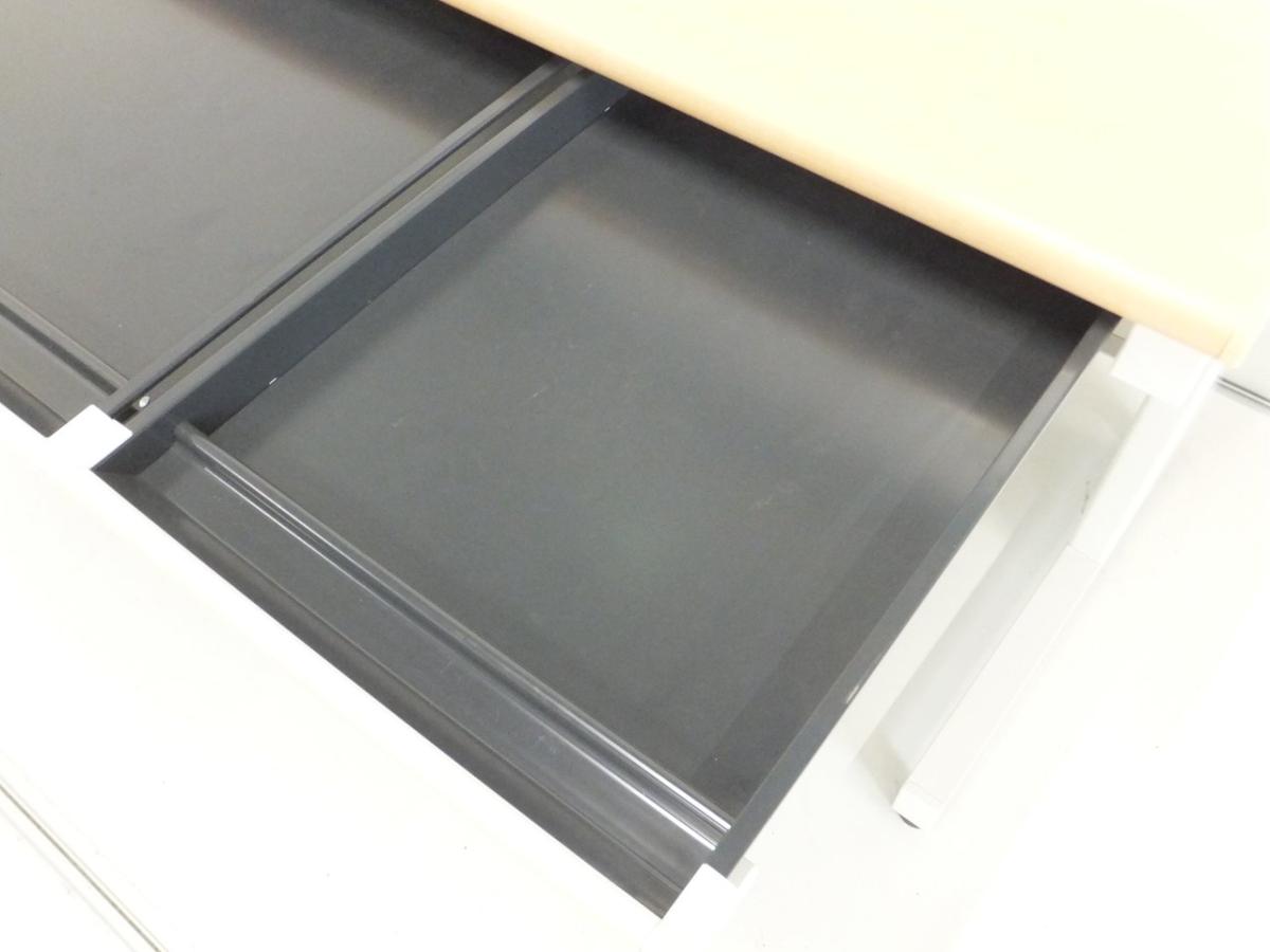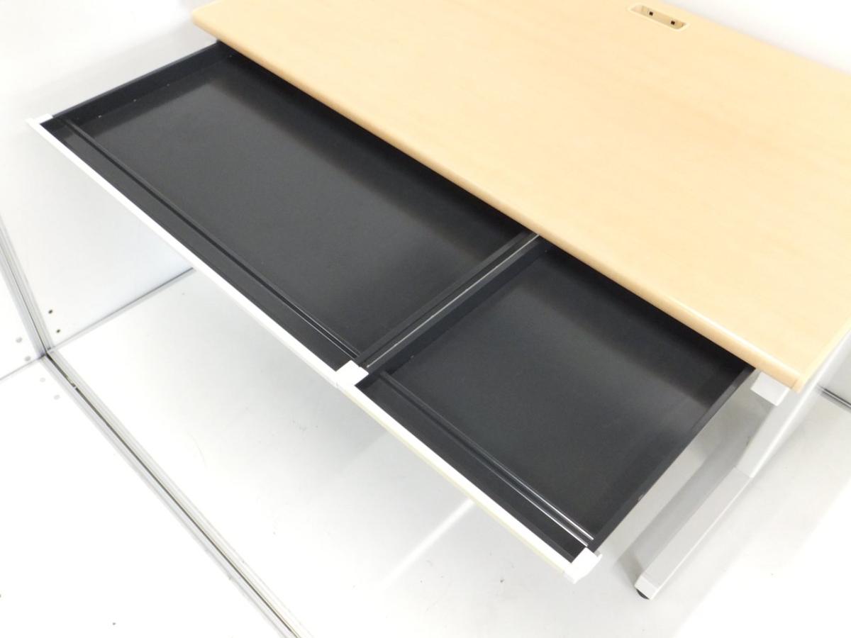 【ベーシックな使いやすさ・ローコストの引き出し付きデスク!】■プラス (PLUS) 製 フラットラインシリーズ 平デスク W1200mm 引き出し付(日焼け有) ■本体:ホワイト 天板:木目ナチュラル(メープル調) 【弊社使用欄:A01040783/A01035962】