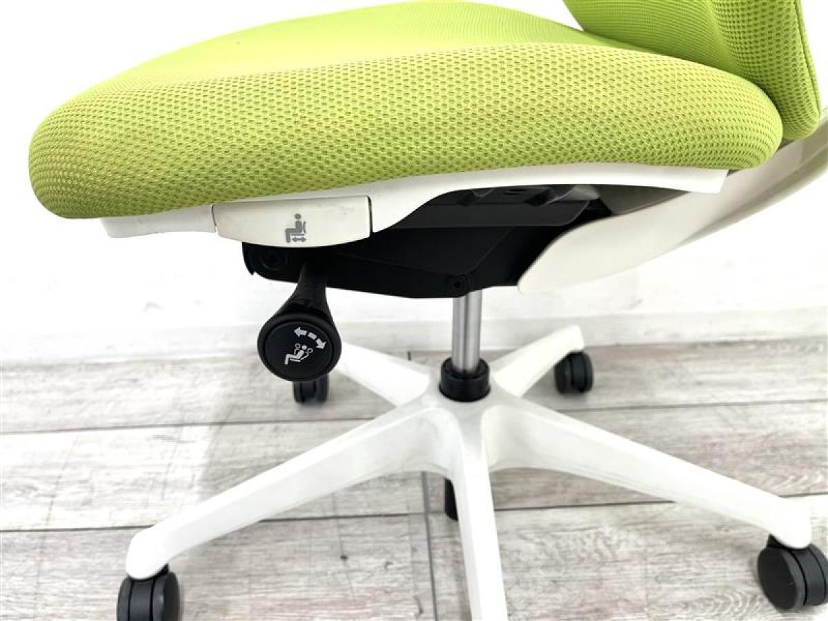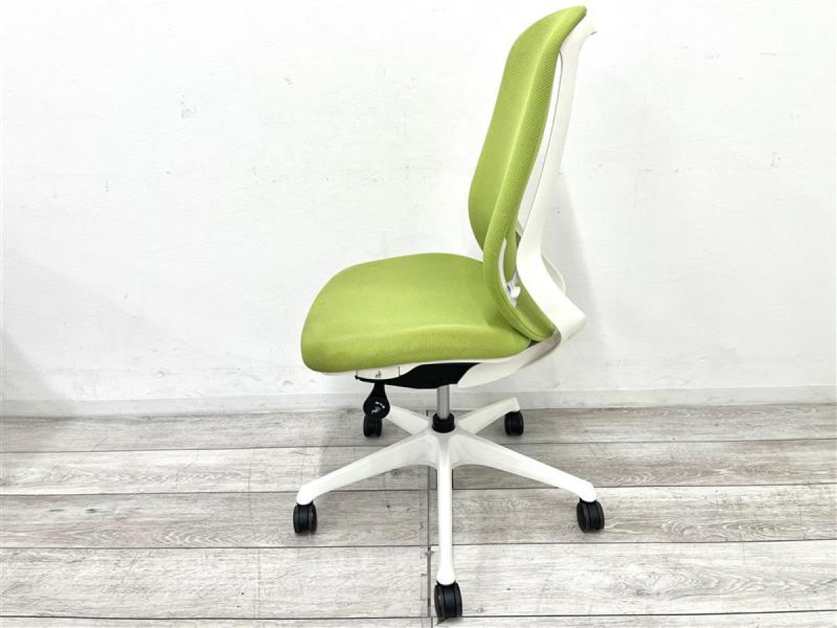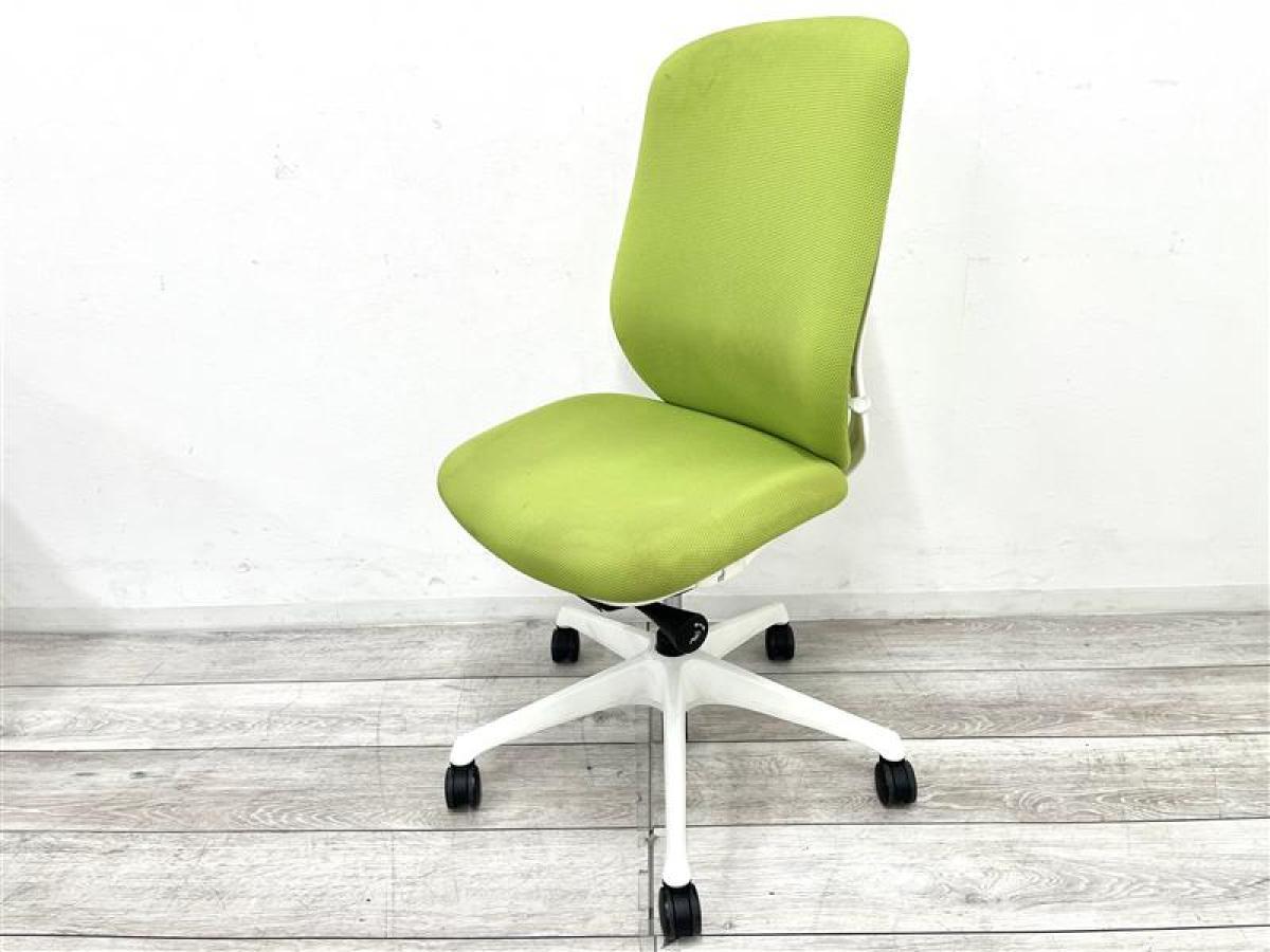 オカムラ製 シルフィーシリーズ ライムグリーン ホワイトフレーム 背面クッション コートハンガー付き 快適な座り心地を実現! 人気シリーズの背面クッションモデル! 肘無しハイバックチェア!!