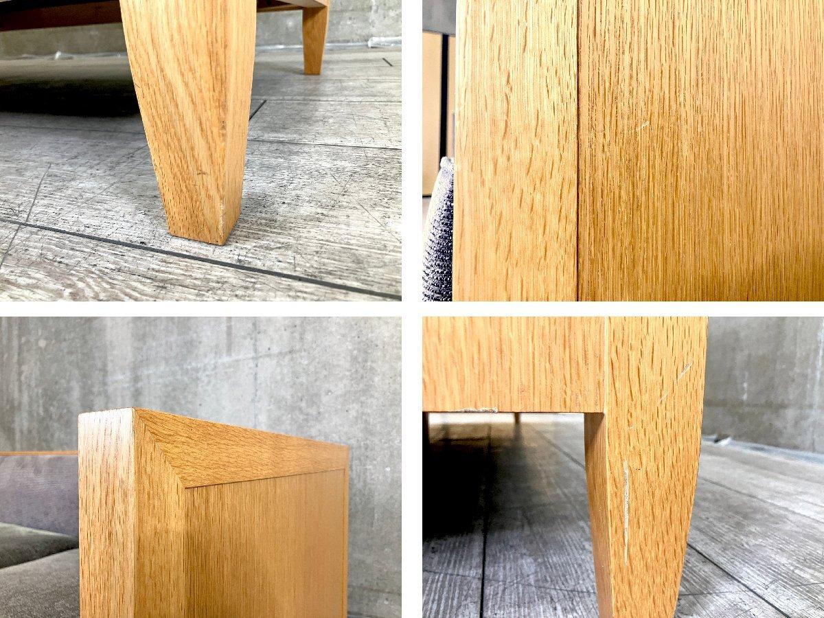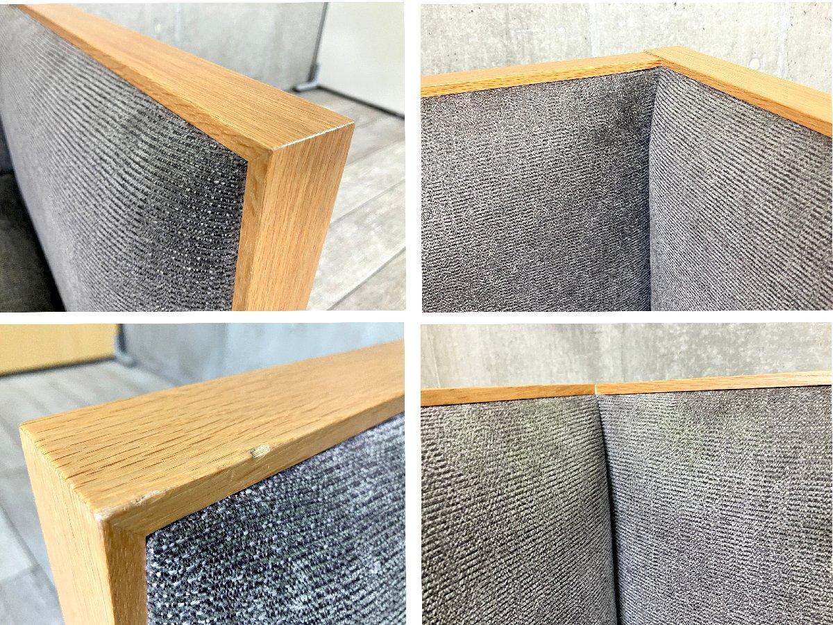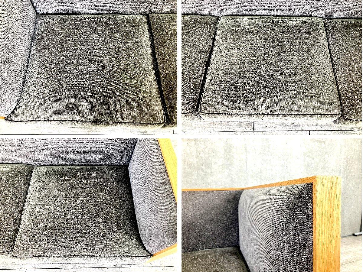 美しい木枠フレームが最大の特徴で、直線的なラインと細部まで丁寧に仕上げられた無垢材の存在感が、空間に凛とした印象を与えます。 グレー系ファブリックのクッションは落ち着いた表情で、木部のナチュラルな色味と相まって、シンプルで品のある佇まいに。