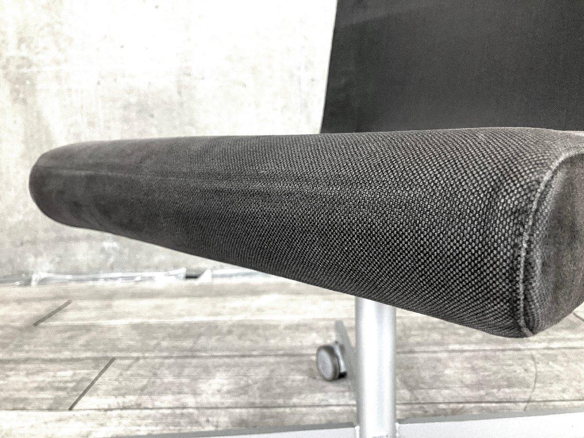 こちらはグレーファブリックの張地に、昇降機能を備えた実用性の高いモデル。 ベースには安定感のあるクロスレッグを採用し、キャスターは堅床にも対応するウレタン仕様のため、フローリングでも滑らかに移動できます。