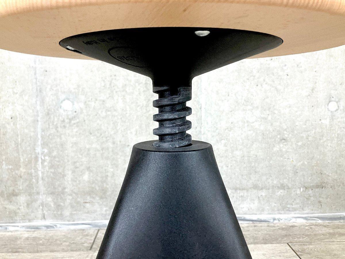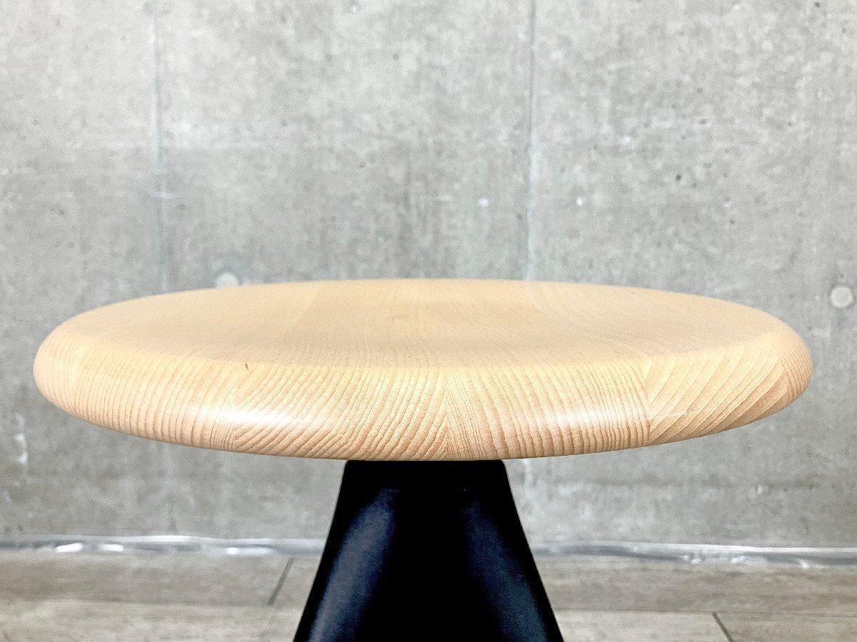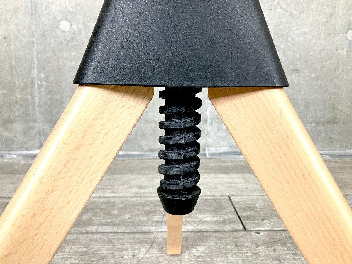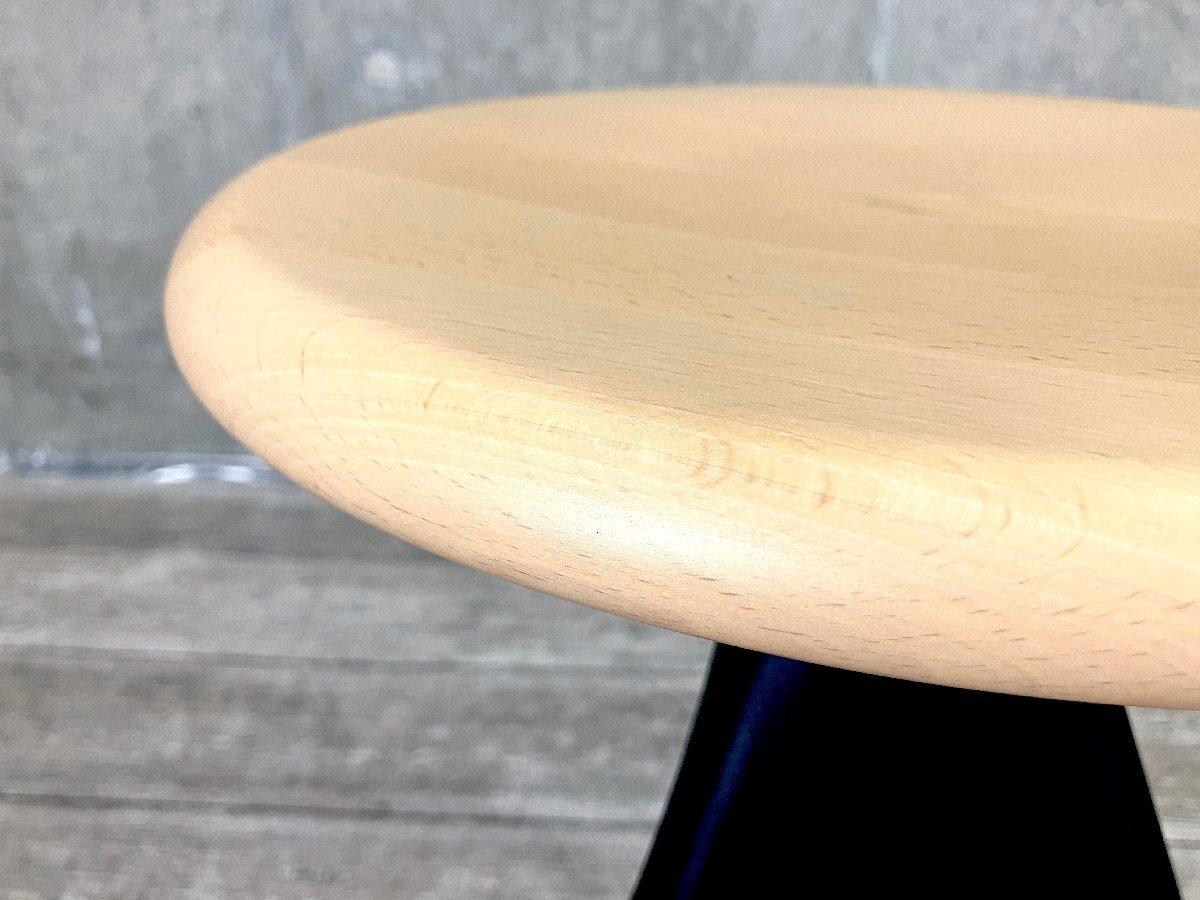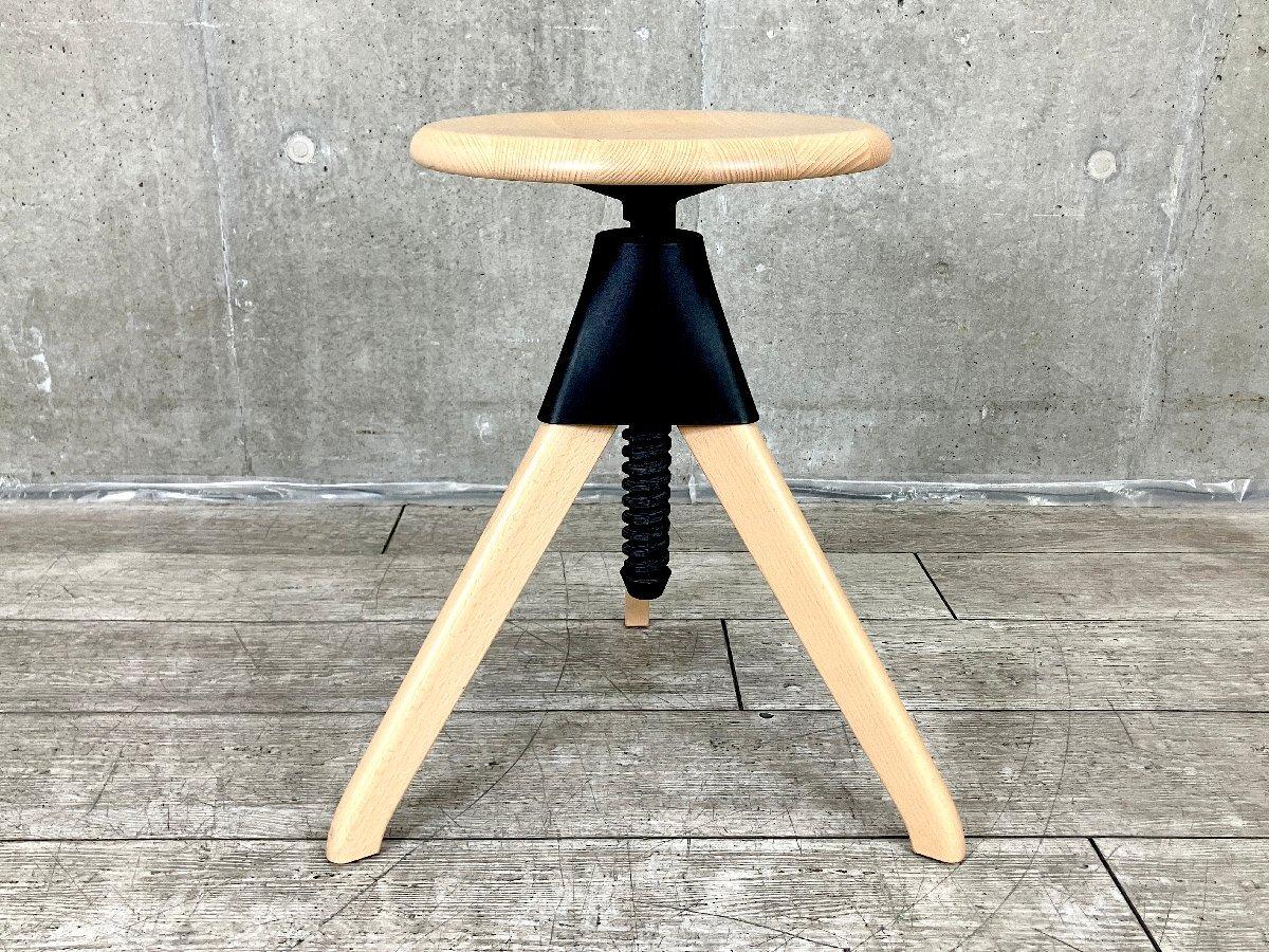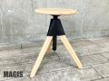 形は古典的な作業用スツールでしが、機構部に使われた色鮮やかな樹脂と、木の質感との対比が斬新な印象を与えてくれます。