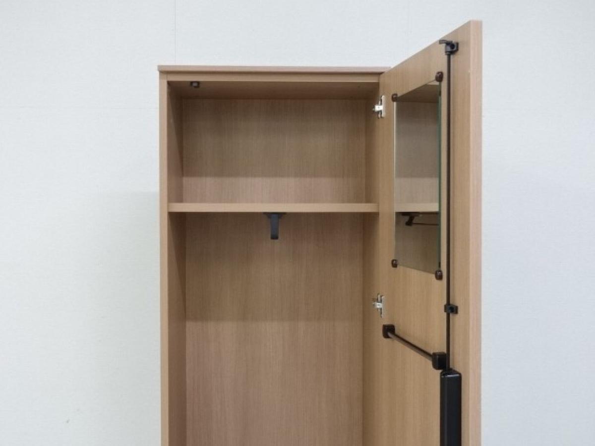上段棚板(固定)・スライドハンガー・下段棚板(可動式)・鏡・ネクタイ掛け付き。
