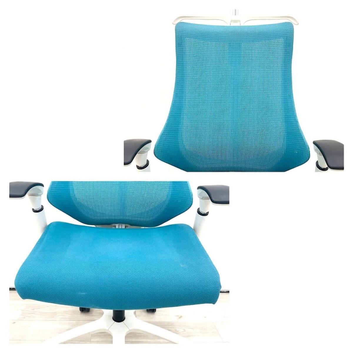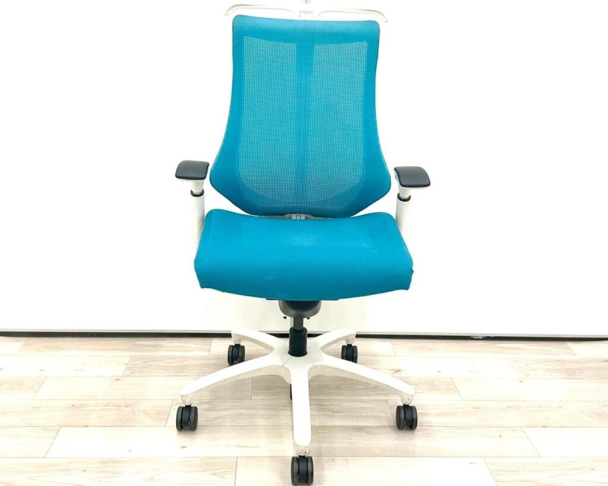 【姿勢の変化にフレキシブルに対応!スタイリッシュで座り心地も抜群な高機能チェア】■イトーキ(ITOKI)製 エフ(f)チェア 肘付き ハイバック 背面メッシュ ■可動肘・ハンガー付 ■ストロングブルー×ホワイトシェル ※日焼け有