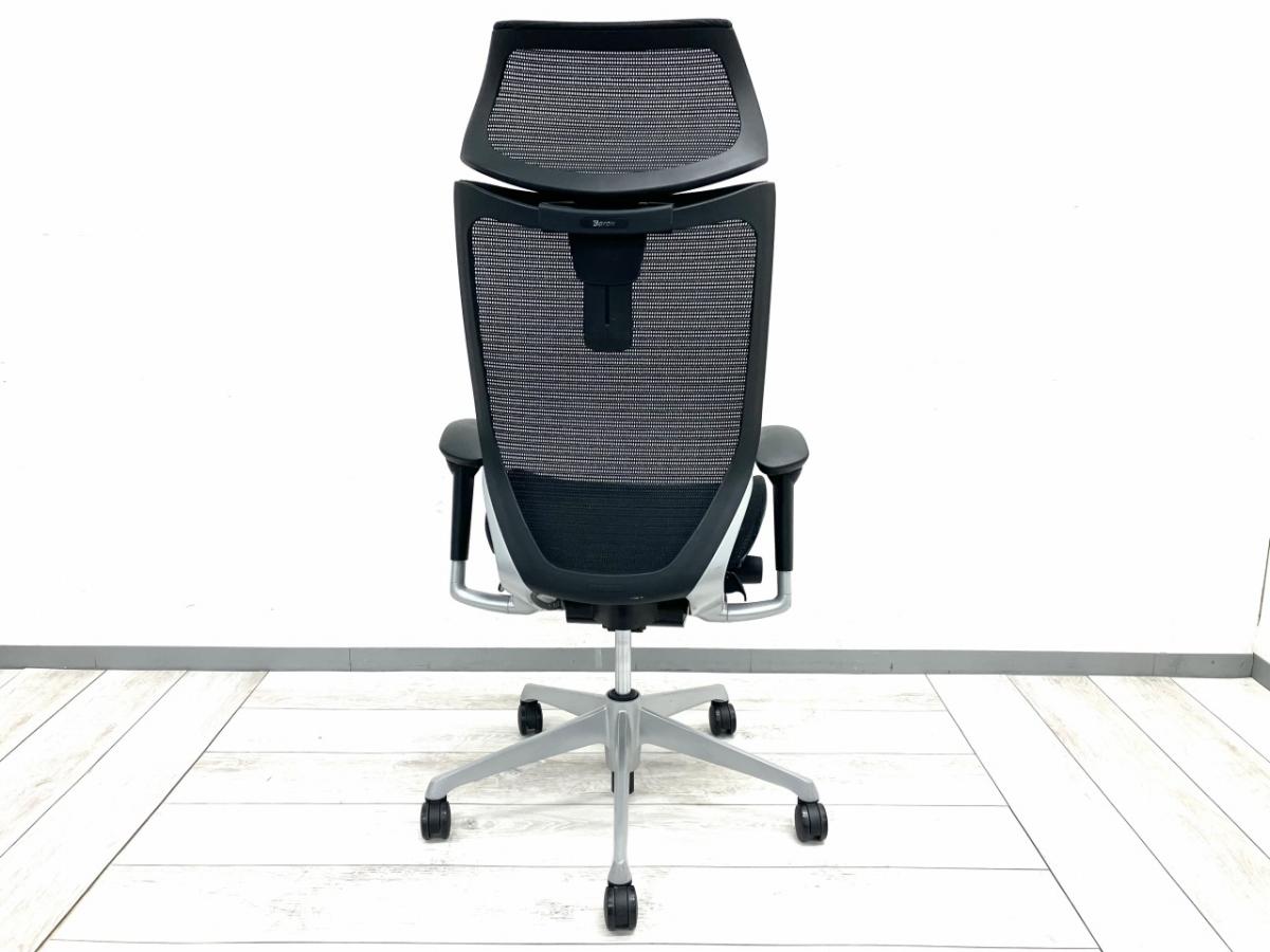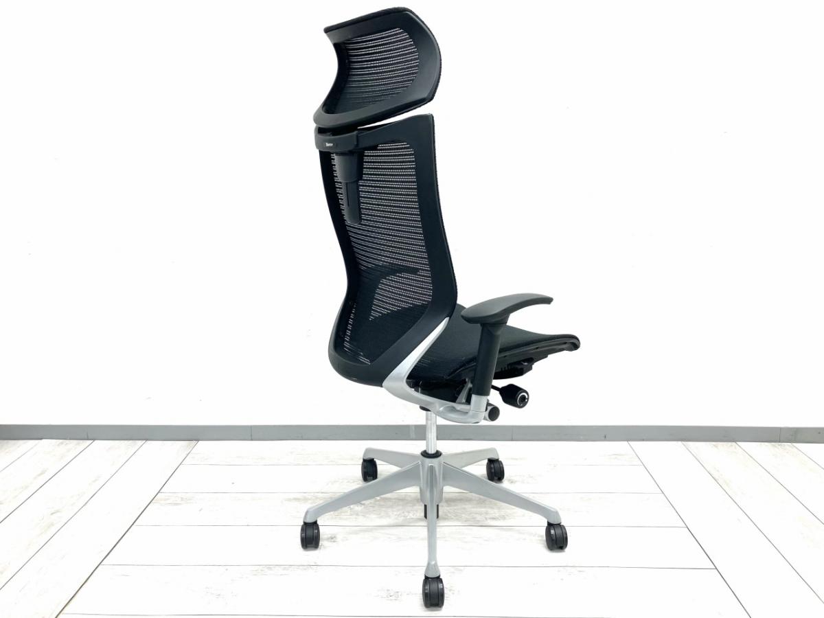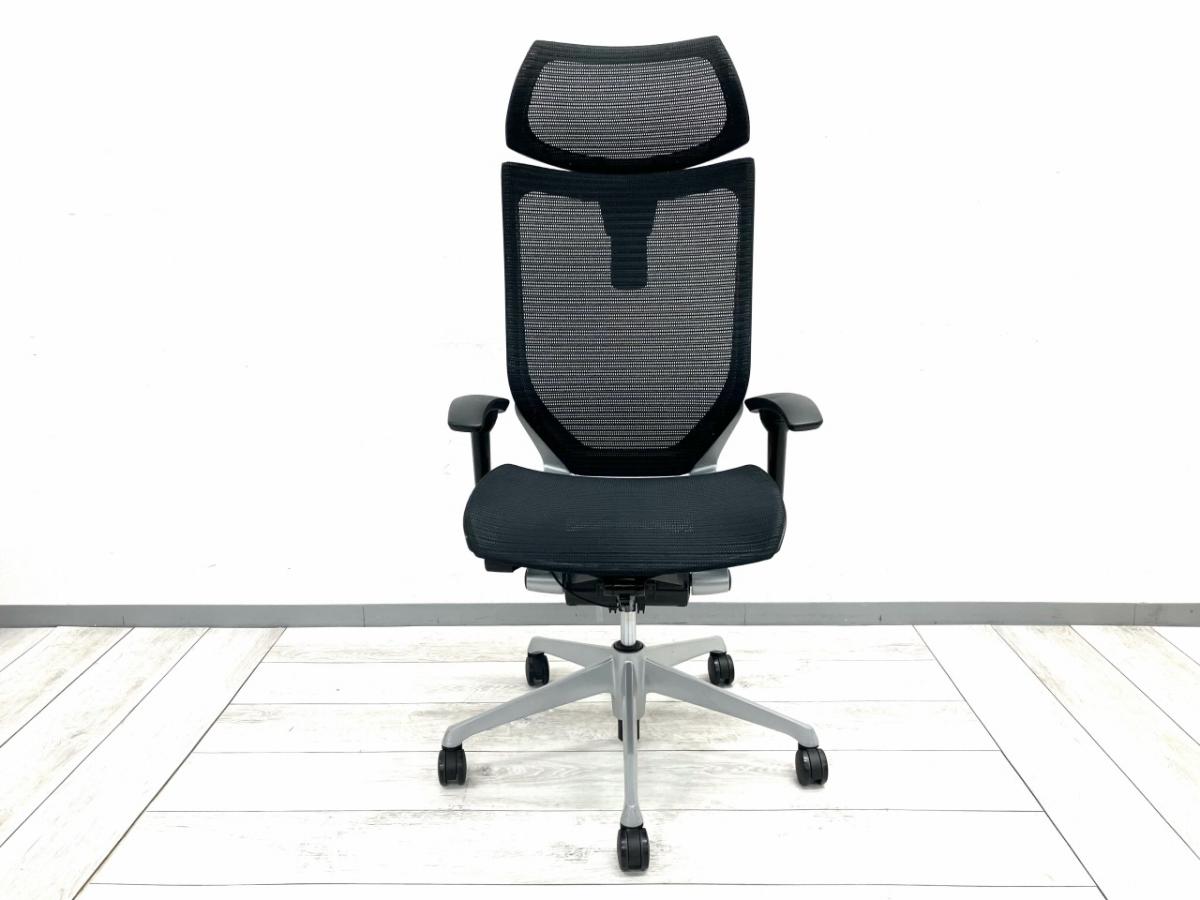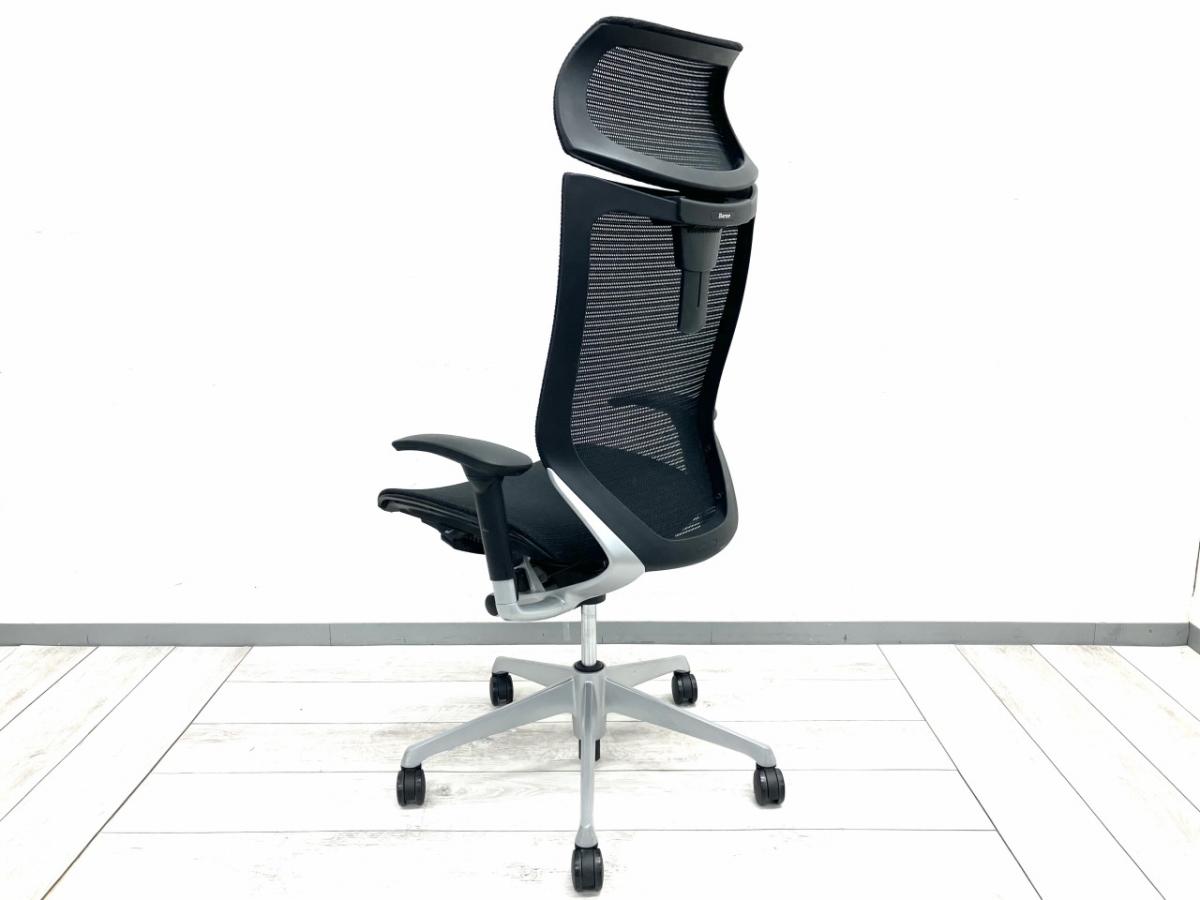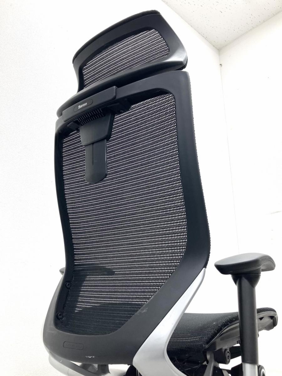 オカムラ製の人気高機能チェア「バロンチェア(Baron)」です。背・座ともに通気性に優れたメッシュ仕様で、長時間の使用でも快適な座り心地を維持します。ヘッドレスト付きのハイバックタイプで、首から腰までをしっかり支え、正しい姿勢を自然にサポートします。