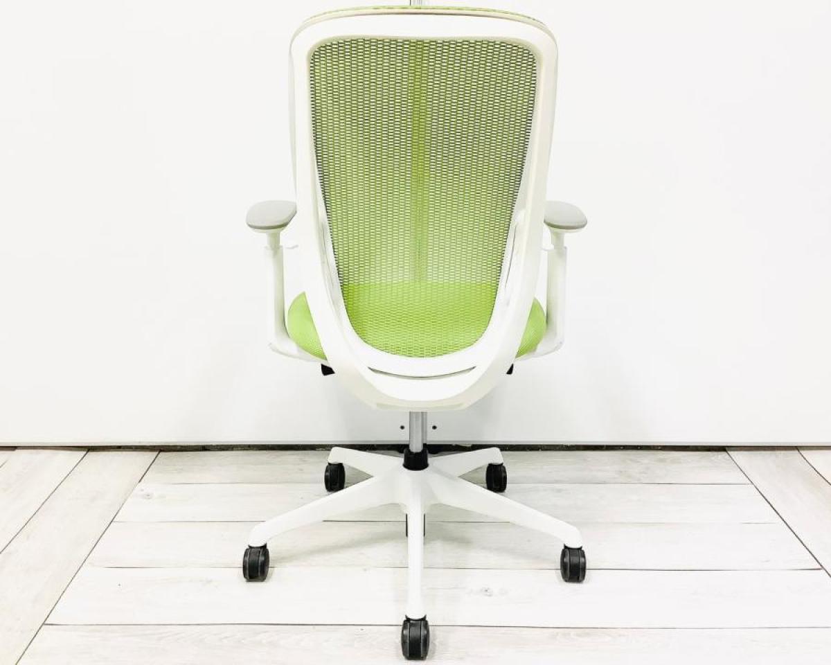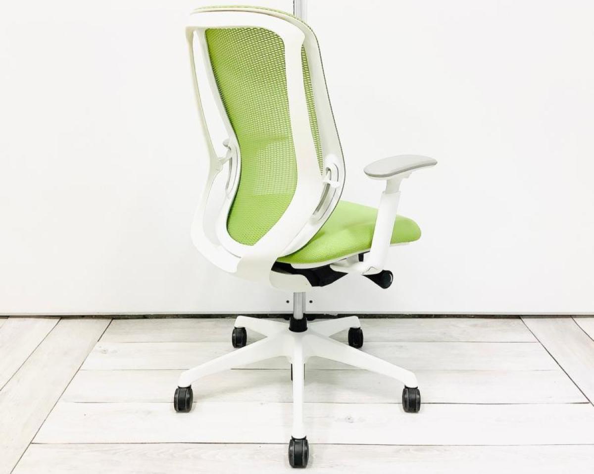 【前傾チルト機能付き】【オカムラ製品で最も人気を集める高機能メッシュチェア!】■オカムラ(okamura)製 シルフィ(Sylphy) 肘付き ハイバック 背面メッシュ ■可動肘 ■ライムグリーン×ホワイトシェル- 品川・三田店