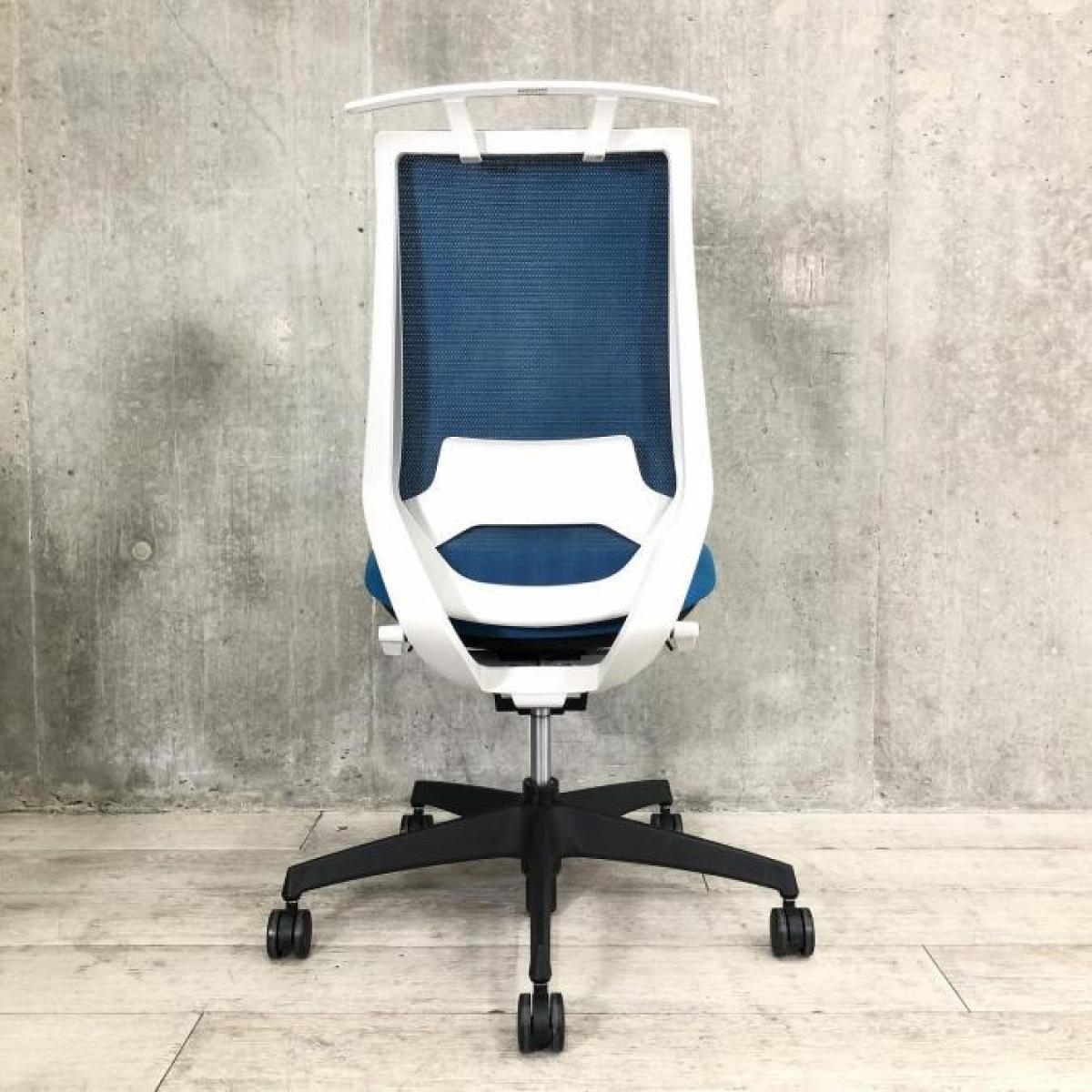 【二重フレーム構造がもたらすしなやかで美しい背もたれ機能!簡易操作で自分に合った姿勢をサポート!】■コクヨ(KOKUYO)製 デュオラ(Duora)チェア 肘無 ハイバック 背面メッシュ ■ランバー・ハンガー付 ■プルシアンブルー×ホワイトシェル×ブラック脚- 大手町・神田サテライト