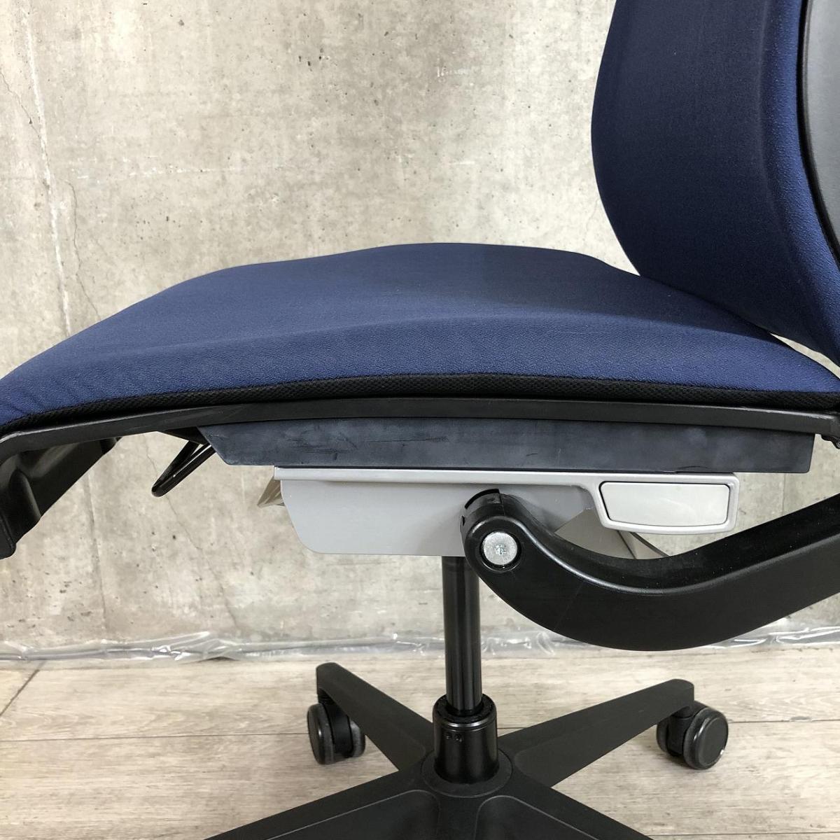快適な座り心地に不可欠な調節機能である、上下昇降、座面の奥行き調整、リクライニングなどを備えており、操作もわかりやすく好評です。 特に、座面の奥行きは、座面下の左右に通った細いバーで調整でき、座ったままで軽やかに滑るように調整が可能です。 価格面では、新品では高めですが、中古は流通も多く、定価の3割前後の価格で高級チェアの座り心地を手に入れることができます!