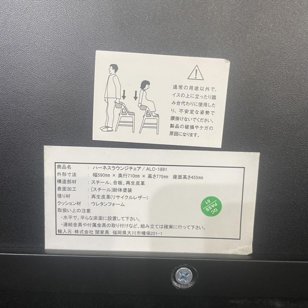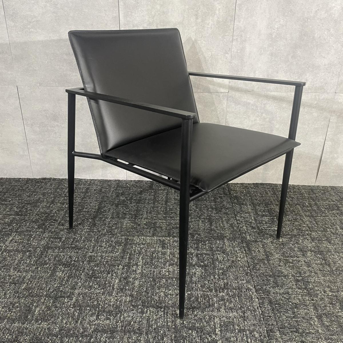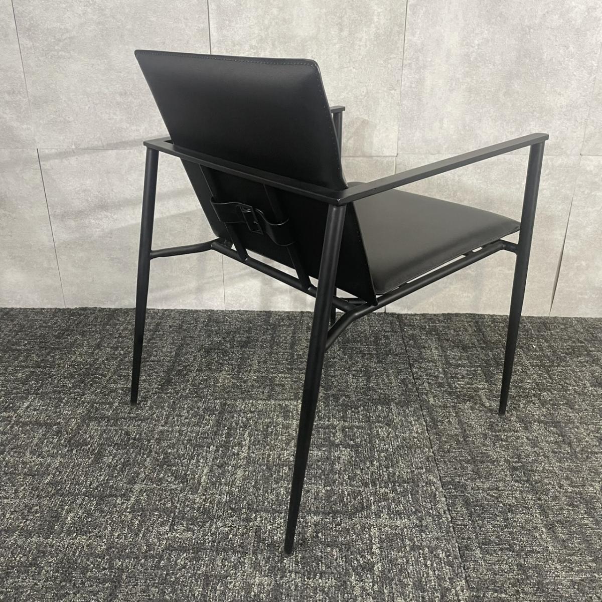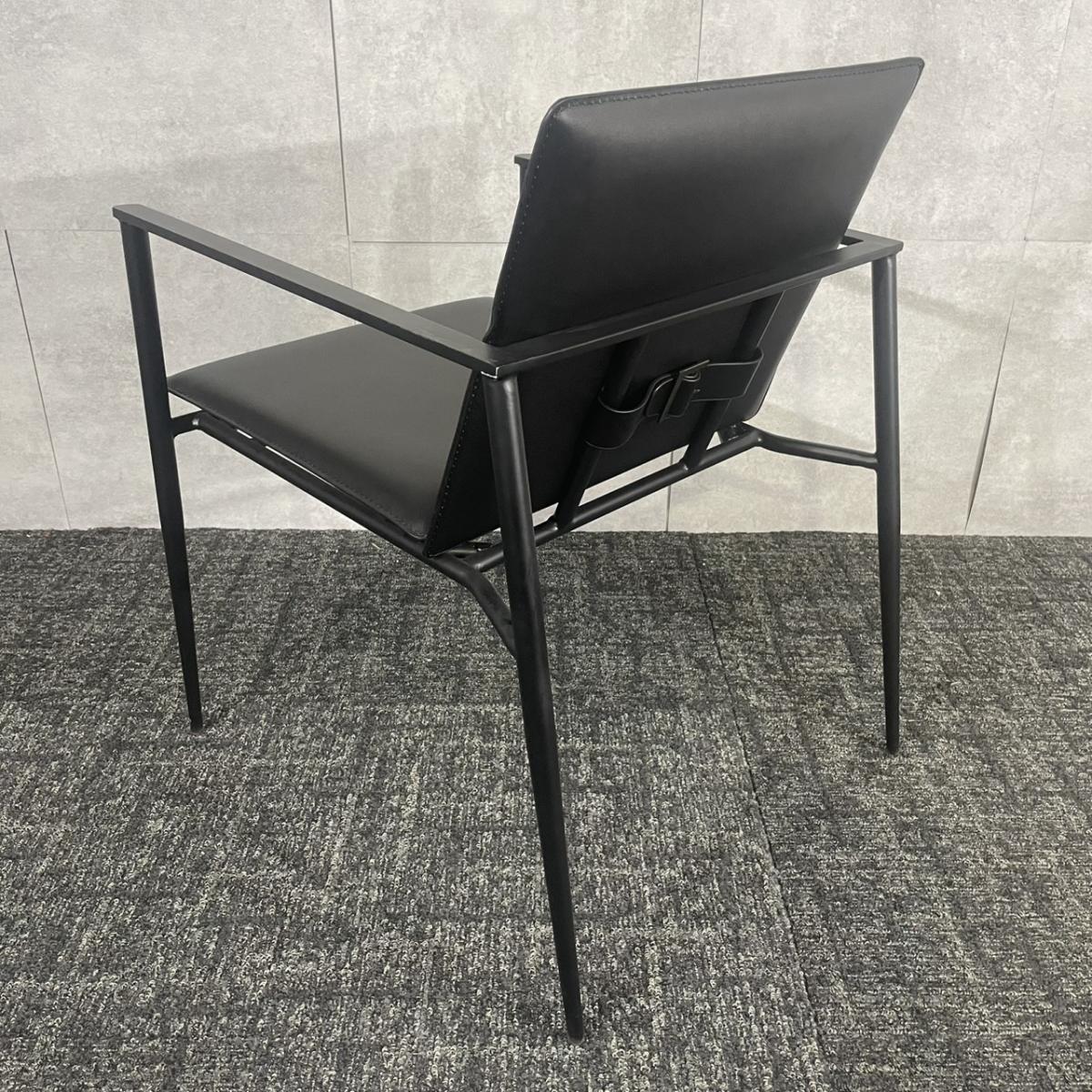 【関家具製ラウンジチェア】 滑らかな質感のリサイクルレザーを使用したアーム付きラウンジチェア。 スリムでシャープなスチールフレーム、直線的な座面、背面のレザーベルトによって、どの角度から見ても洗練された佇まい 福岡 中古家具 安い 特価品 レア 九州最大級- 福岡博多店