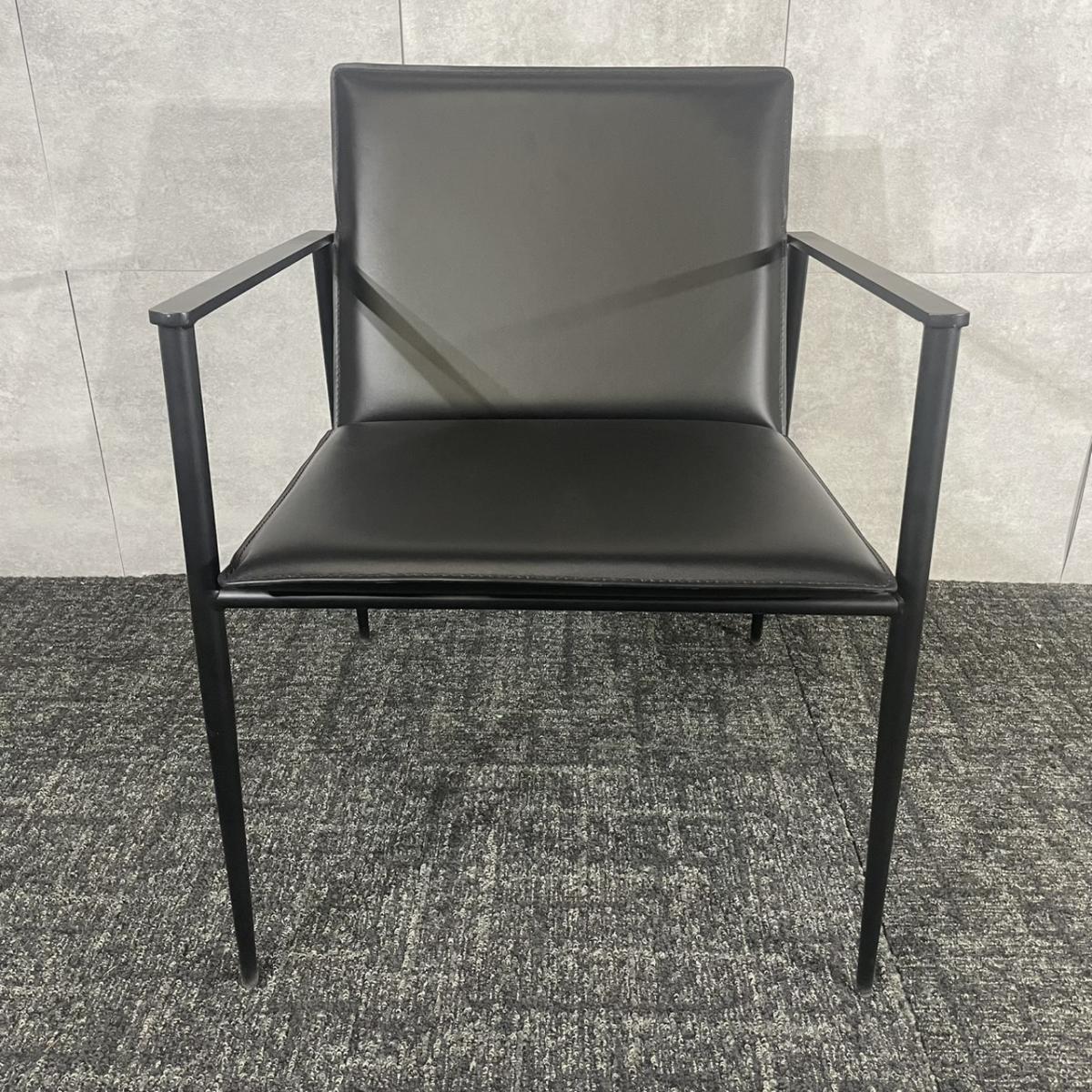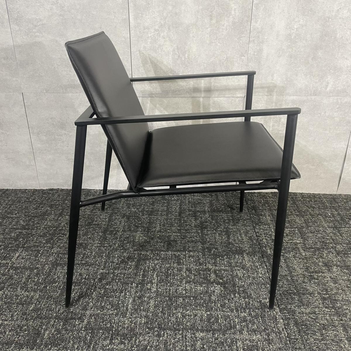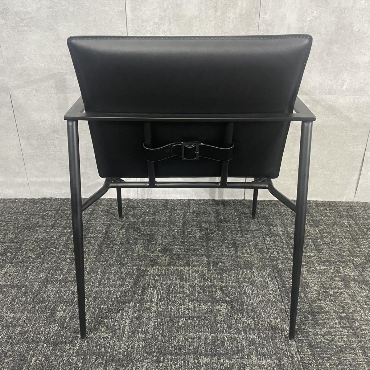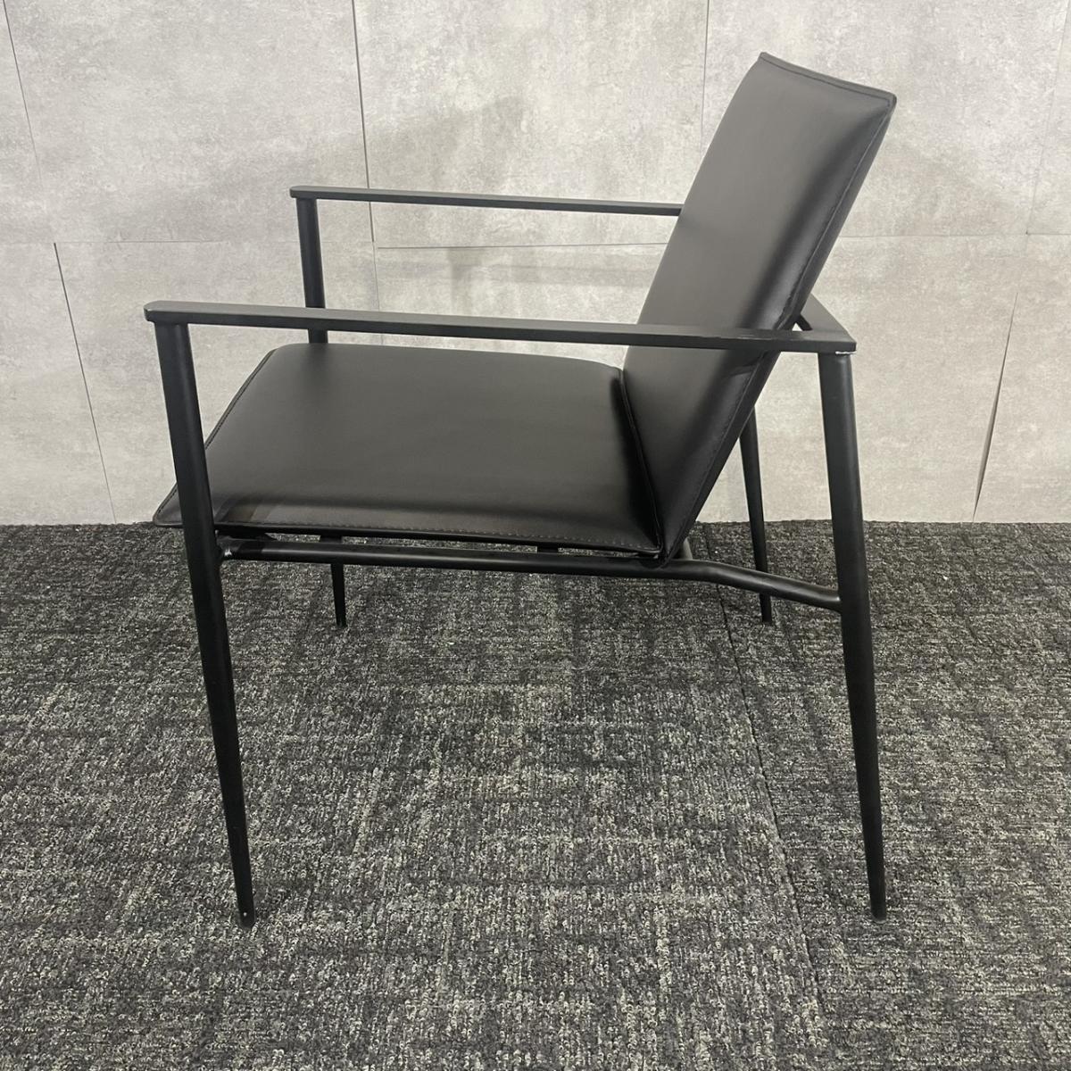 【関家具製ラウンジチェア】 滑らかな質感のリサイクルレザーを使用したアーム付きラウンジチェア。 スリムでシャープなスチールフレーム、直線的な座面、背面のレザーベルトによって、どの角度から見ても洗練された佇まい 福岡 中古家具 安い 特価品 レア 九州最大級- 福岡博多店