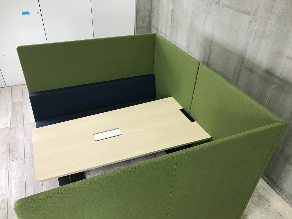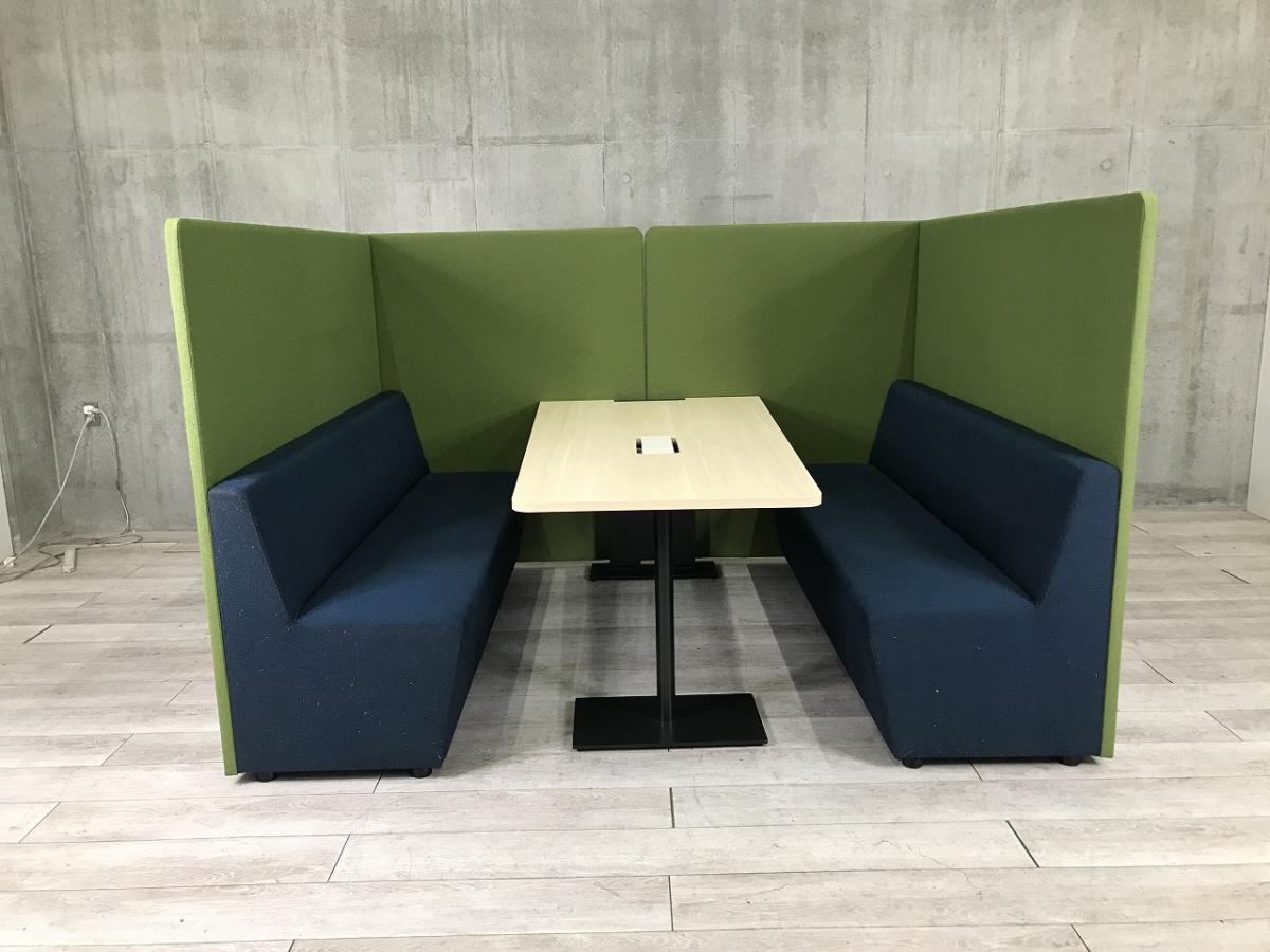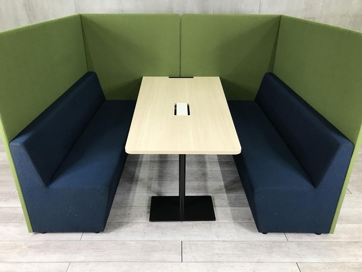【ミーテイングワークソファのスタンダード!モニターフレーム付きのテーブルがセット!】■ウチダ(UCHIDA)製 ベイクシリーズ(BAKE) ミーティングブース ファミレスブース ■テーブル:モニターフレーム付き 配線口付き ■ソファ:ブルー パネル:グリーン 【ABW商材】【関東倉庫在庫品】【弊社使用欄:A01026680】- 全店共通商品