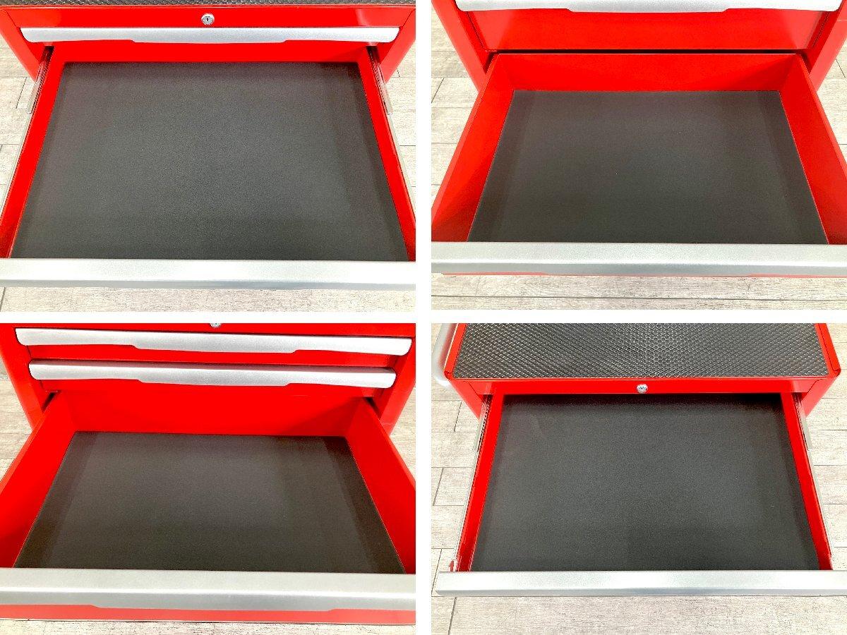 複数の引き出しは浅型から深型までバランスよく配置され、ソケット類から大型工具まで整理しやすい構成。いずれもスムーズに開閉できるレールを採用しており、頻繁な出し入れにもストレスがありません。 下部にはKTCロゴ入りで、ブランドらしい存在感もポイント。