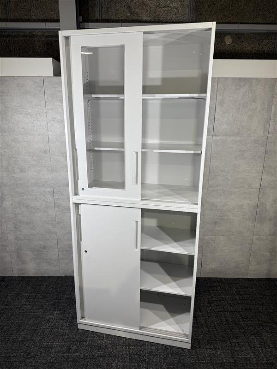 【1セット限定】【下の書庫に傷あり】【開閉時に場所を取らない引き違い戸の書庫セット!】■ウチダ製 HSシリーズ 引き違い+引き違い ハイキャビネット 2枚引き戸 ■ホワイト ■シリンダー錠 オフィスバスターズ 梅田本店【未】