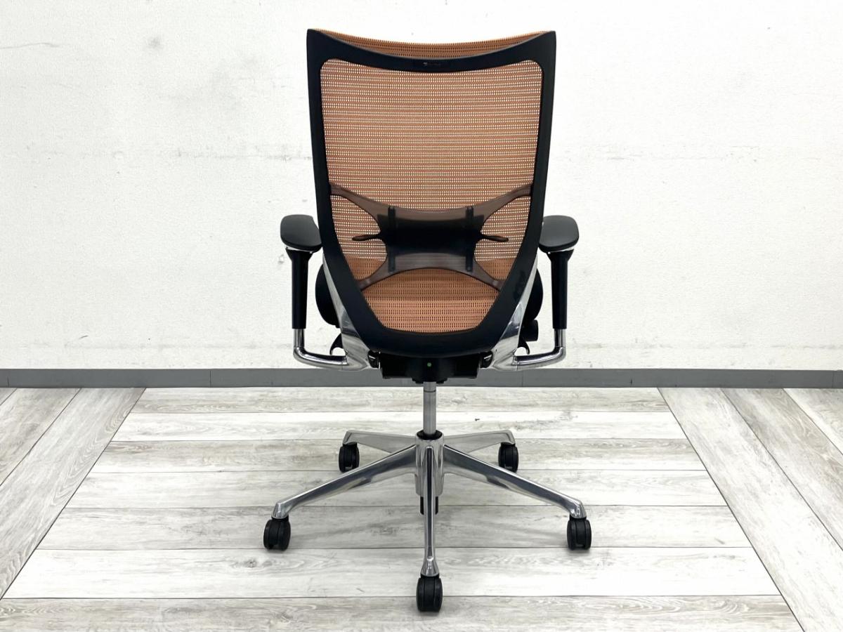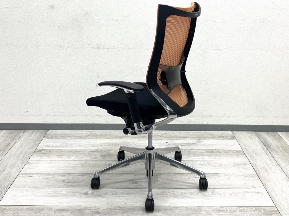 オレンジメッシュは視覚的に華やかで、オフィス空間にアクセントを加えるデザイン性の高いカラーです。ランバーサポートと可動肘の組み合わせにより、体への負担を抑えつつ自然な姿勢を維持でき、長時間のデスクワークにも向いています。バロン特有の軽いリクライニングとメッシュの通気性は快適で、ポリッシュ脚が高級感のある印象を与えてくれます。デザイン・快適性・機能性のバランスが優れた一脚です。